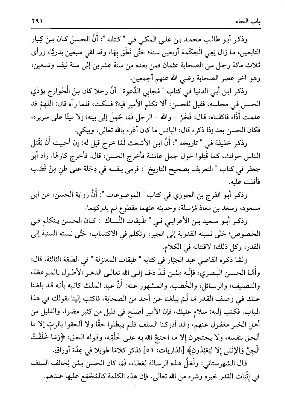 قال الشهرستاني: ولعَلَّ هذه الرسالة لِعَطاء، فَمَا كان الحسن مِمَّن يُخالف السلف في إِثْبَات القدر خيره وشره من اللَّه تعالى، فإن هذه الكلمة كالمُجْمَع عليها عندهم.