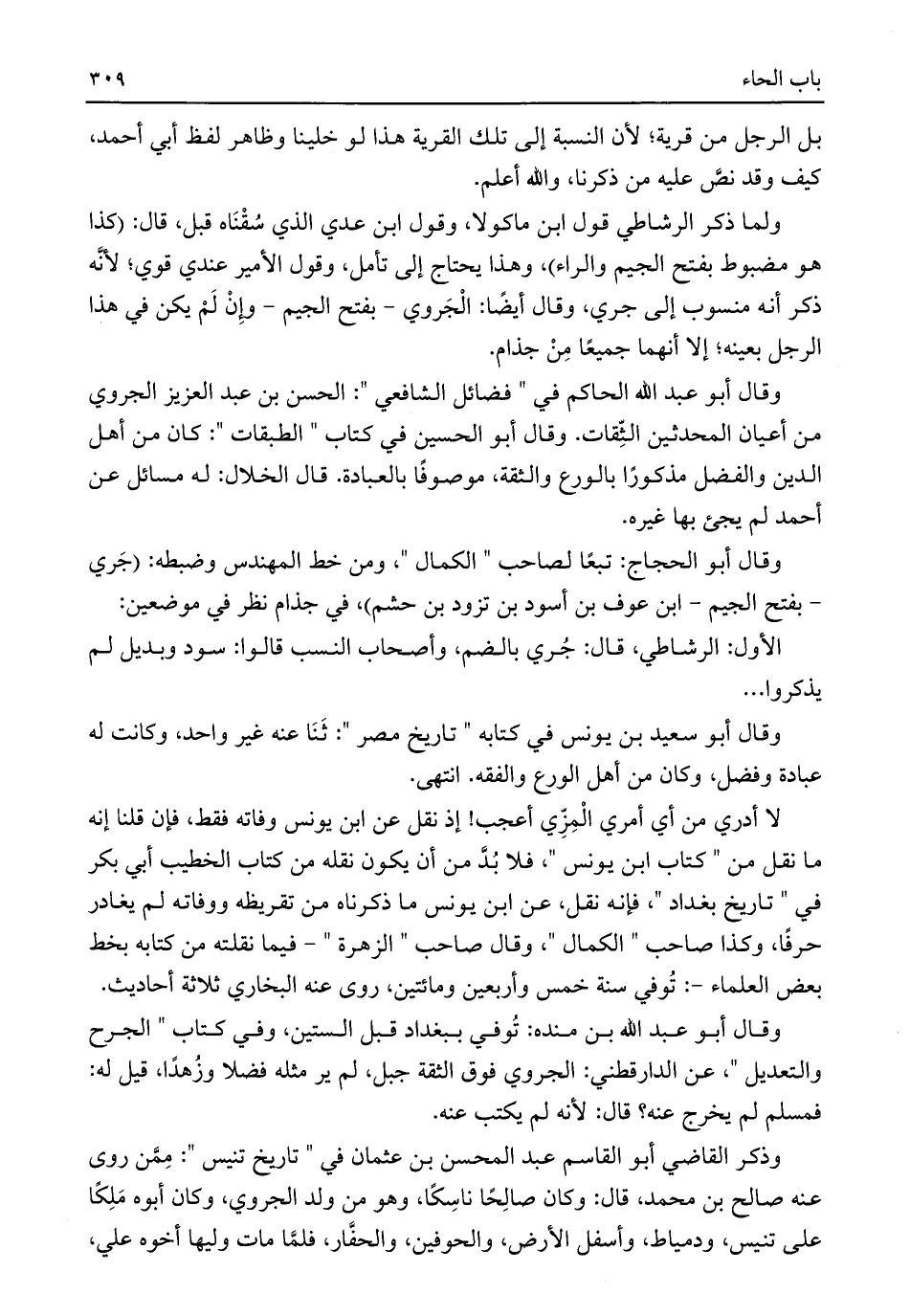 ولما ذكر الرشاطي قول ابن ماكولا، وقول ابن عدي الذي سُقْنَاه قبل، قال: (كذا هو مضبوط بفتح الجيم والراء)، وهذا يحتاج إلى تأمل، وقول الأمير عندي قوي؛ لأنَّه ذكر أنه منسوب إلى جري، وقال أيضًا: الْجَروي -بفتح الجيم- وإِنْ لَمْ يكن في هذا الرجل بعينه؛ إلا أنهما جميعًا مِنْ جذام.