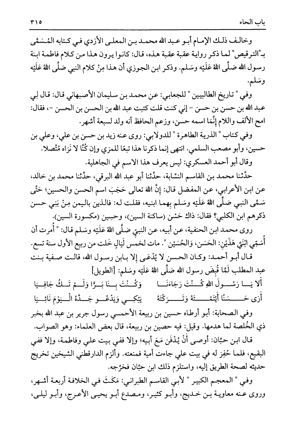 حدَّثنا محمد بن القاسم النسَّابة، حدَّثنا أبو عبد اللَّه البرقي، حدَّثنا محمد بن خالد، عن ابن الأعرابي، عن المفضل قال: إِنَّ اللَّهَ تعالى حَجَبَ اسم الحسن والحسين؛ حَتَّى سَمَّى النبي صَلَّى اللَّهُ عَلَيْه وسَلَّم بِهما ابنيه، فقلت له: فالذين باليمن مِنْ بَنِي حسن ذكرهم ابن الكلبي؟ فقال: ذاك حَسْن (ساكنة السين)، وحسِين (مكسورة السين).