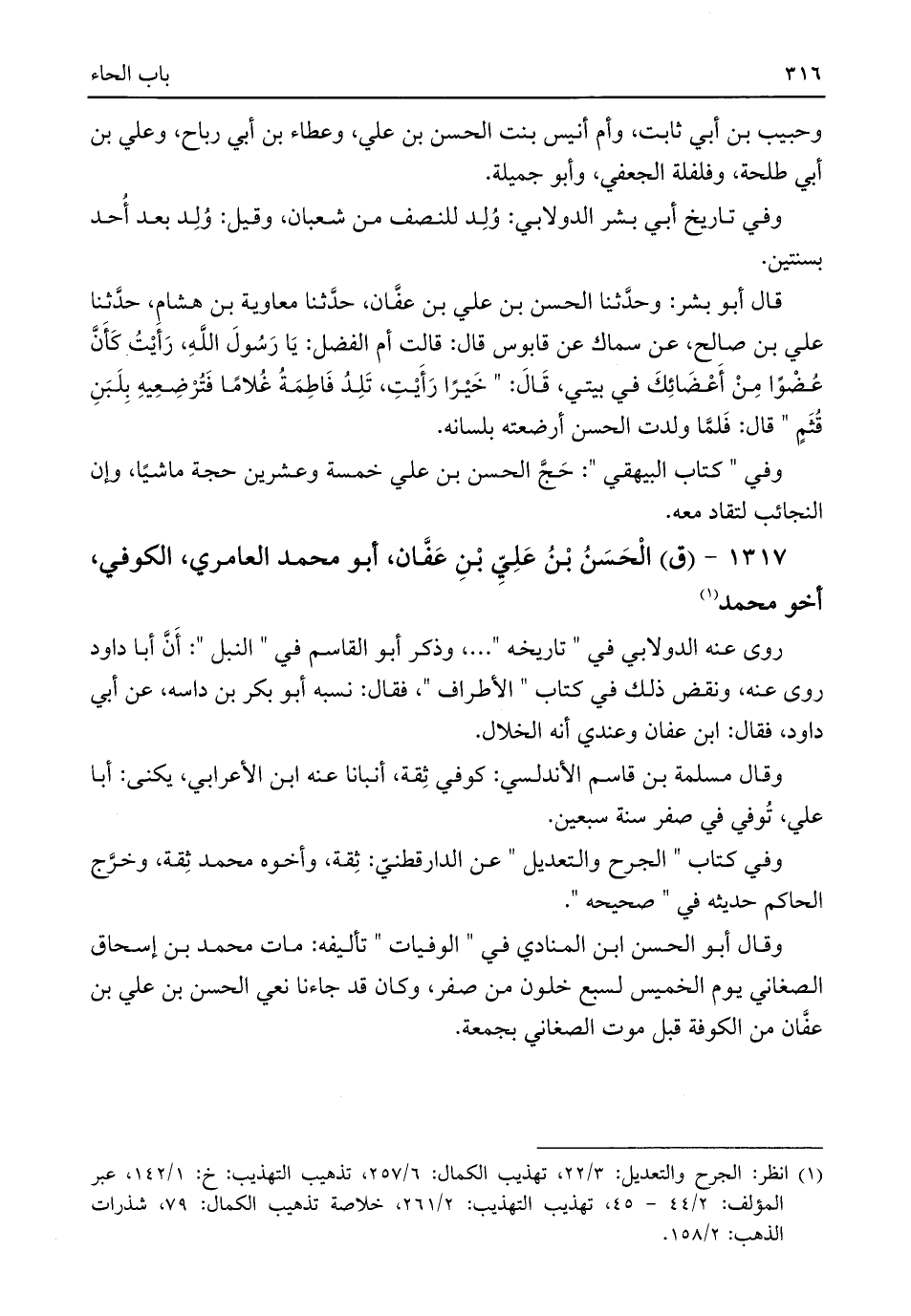 ١٣١٧ - (ق) الْحَسَنُ بْنُ عَلِيِّ بْنِ عَفَّان، أبو محمد العامري، الكوفي، أخو محمد (¬١)