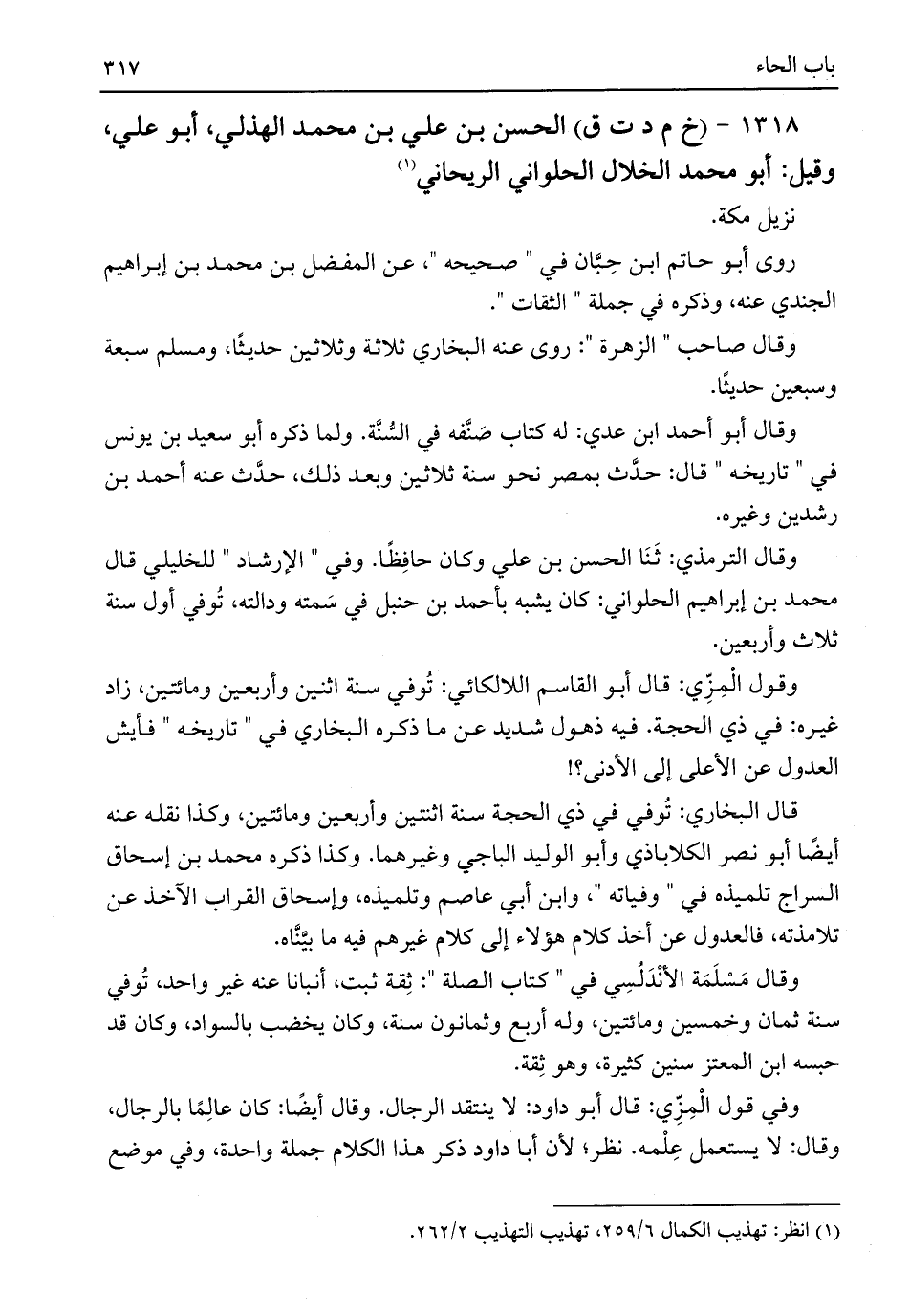 ١٣١٨ - (خ م د ت ق) الحسن بن علي بن محمد الهذلي، أبو علي، وقيل: أبو محمد الخلال الحلواني الريحاني (¬١)
