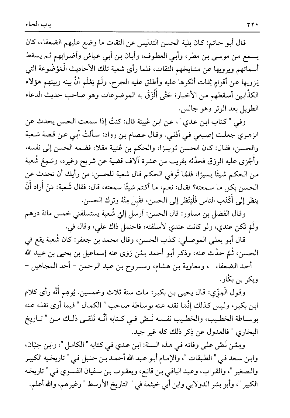 قال أبو حاتم: كان بلية الحسن التدليس عن الثقات ما وضع عليهم الضعفاء، كان يسمع من موسى بن مطر، وأبي العطوف، وأبان بن أبي عياش وأضرابهم ثم يسقط أسمائهم ويرويها عن مشايخهم الثقات، فلما رأى شعبة تلك الأحاديث الْمَوْضُوعة التي يَرْويها عن أقوامٍ ثِقات أنكرها عليه وأطلق عليه الجرح، ولَمْ يَعْلَم أنَّ بينه وبينهم هؤلاء الكذَّابين أسقطهم من الأخبار؛ حَتَّى أَلْزَقَ به الموضوعات وهو صاحب حديث الدعاء الطويل بعد الوتر وهو جالس.