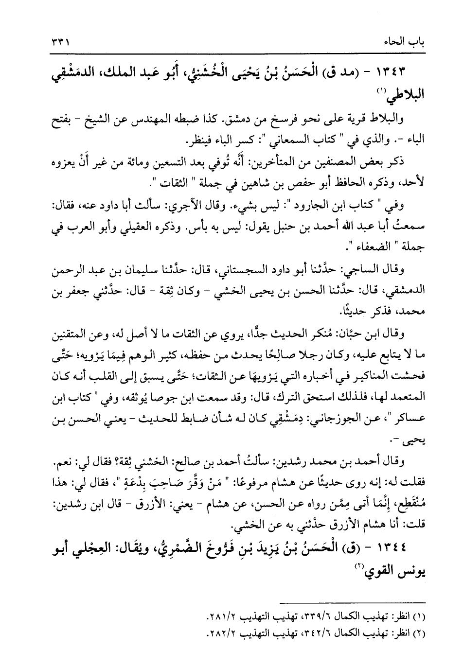 ١٣٤٣ - (مد ق) الْحَسَنُ بْنُ يَحْيَى الْخُشَنِيُّ، أَبُو عَبد الملك، الدمَشْقِي البلاطي (¬١)