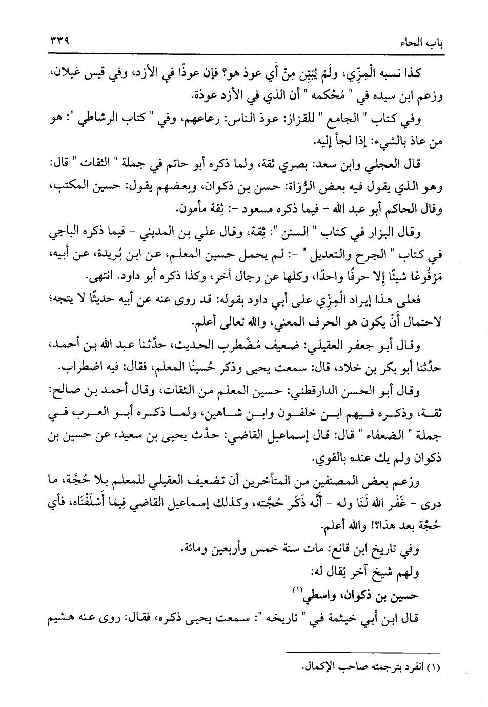 وقال البزار في كتاب "السنن": ثِقة، وقال علي بن المديني -فيما ذكره الباجي في كتاب "الجرح والتعديل"-: لم يحمل حسين المعلم، عن ابن بُريدة، عن أبيه، مَرْفُوعًا شيئًا إِلا حرفًا واحدًا، وكلها عن رجال أخر، وكذا ذكره أبو داود. انتهى.