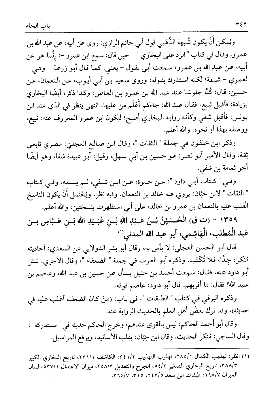 ويُمْكن أَنْ يكون شُبهة الذَّهَبي قولط أبي حاتم الرازي: روى عن أبيه، عن عبد اللَّه بن عمرو. وقال في كتاب "الرد على البخاري" -حين قال: سمع ابن عمرو-: إِنَّما هو عن أبيه، عن عبد اللَّه بن عمرو، سمعت أبي يقول -يعني: كما قال أبو زرعة- وهي -لعمري- شبهة؛ لكنه استدرك بقوله: وروى سعيد بن أبي أيوب، عن النعمان، عن حسين، قال: كُنَّا جلوسًا عند عبد اللَّه بن عمرو بن العاص، وكذا ذكره أيضًا البخاري بزيادة: فأقبل تبيع، فقال عبد اللَّه: جاءكم أَعْلَم من عليها. انتهى ينظر في الذي عند ابن يونس: فأقبل شفي وكأنه رواية البخاري أصح؛ ليكون ابن عمرو المعروف عنه: تبيع، ووصفه بهذا أو نحوه، واللَّه أعلم.