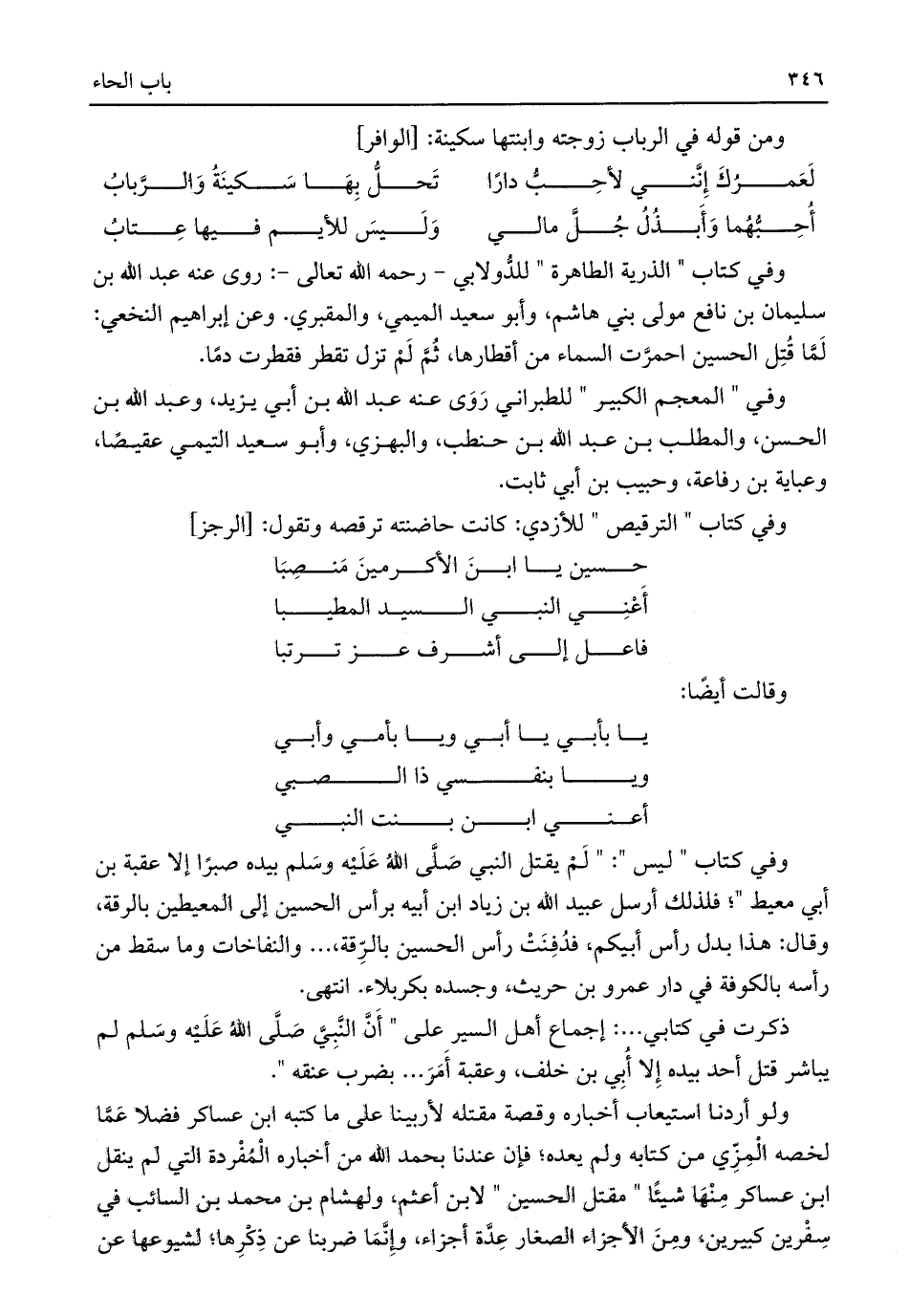 ولو أردنا استيعاب أخباره وقصة مقتله لأربينا على ما كتبه ابن عساكر فضلا عَمَّا لخصه الْمِزّي من كتابه ولم يعده؛ فإن عندنا بحمد اللَّه من أخباره الْمُفْردة التي لم ينقل ابن عساكر مِنْها شيئًا "مقتل الحسين" لابن أعثم، ولهشام بن محمد في السائب في سِفْرين كييرين، ومِنَ الأجزاء الصغار عِدَّة أجواء، وإِنَّمَا ضربنا عن ذِكْرِها؛ لشيوعها عن