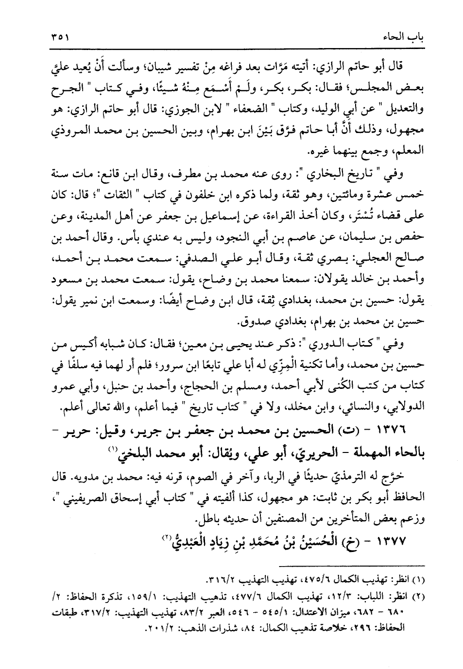 ١٣٧٦ - (ت) الحسين بن محمد بن جعفر بن جرير، وقيل: حرير -بالحاء المهملة- الحريريّ، أبو علي، ويُقال: أبو محمد البلخيّ (¬١)