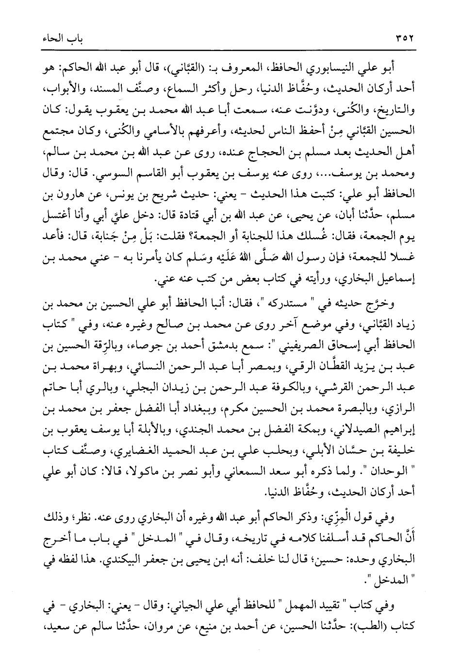 أبو علي النيسابوري الحافظ، المعروف بـ: (القبَّاني)، قال أبو عبد اللَّه الحاكم: هو أحد أركان الحديث، وحُفَّاظ الدنيا، رحل وأكثر السماع، وصنَّف المسند، والأبواب، والتاريخ، والكُنى، ودوَّنت عنه، سمعت أبا عبد اللَّه محمد بن يعقوب يقول: كان الحسين القبَّاني مِنْ أحفظ الناس لحديثه، وأعرفهم بالأسامي والكُنى، وكان مجتمع أهل الحديث بعد مسلم بن الحجاج عنده، روى عن عبد اللَّه بن محمد بن سالم، ومحمد بن يوسف. . .، روى عنه يوسف بن يعقوب أبو القاسم السوسي. قال: وقال الحافظ أبو علي: كتبت هذا الحديث - يعني: حديث شريح بن يونس، عن هارون بن مسلم، حدَّثنا أبان، عن يحيى، عن عبد اللَّه بن أبي قتادة قال: دخل عليَّ أبي وأنا أغتسل يوم الجمعة، فقال: غُسلك هذا للجنابة أو الجمعة؟ فقلت: بَلْ مِنْ جَنابة، قال: فأعد غسلا للجمعة؛ فإن رسول اللَّه صَلَّى اللَّهُ عَلَيْه وسَلَّم كان يأمرنا به - عني محمد بن إسماعيل البخاري، ورأيته في كتاب بعض من كتب عنه عني.