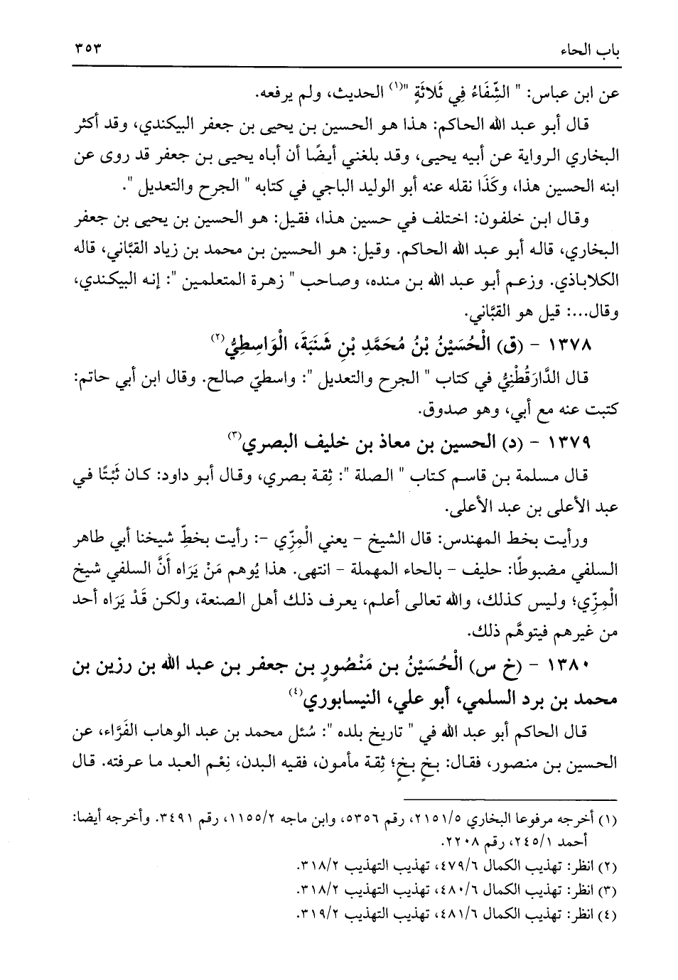 وقال ابن خلفون: اختلف في حسين هذا، فقيل: هو الحسين بن يحيى بن جعفر البخاري، قاله أبو عبد اللَّه الحاكم. وقيل: هو الحسين بن محمد بن زياد القبَّاني، قاله الكلاباذي. وزعم أبو عبد اللَّه بن منده، وصاحب "زهرة المتعلمين": إنه البيكندي، وقال. . .: قيل هو القبَّاني.