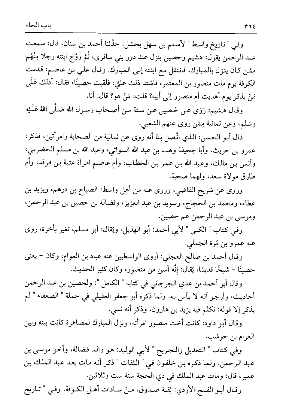وقال أحمد بن صالح العجلي: أروى الواسطيين عنه عباد بن العوام، وكان -يعني حصينًا- شيخًا قديمًا، يُقال: إِنَّه أسن من منصور، وكان كثير الحديث.