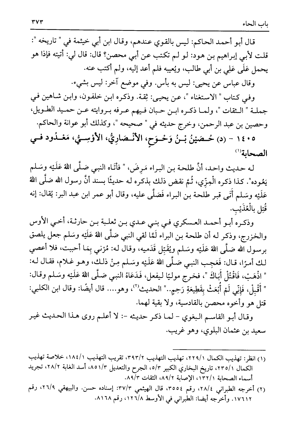 ١٤٠٥ - (د) حُصَيْنُ بْنُ وَحْوَحٍ، الأنْصَارِيُّ، الأوْسِيُّ، مَعْدُود في الصحابة (¬١)