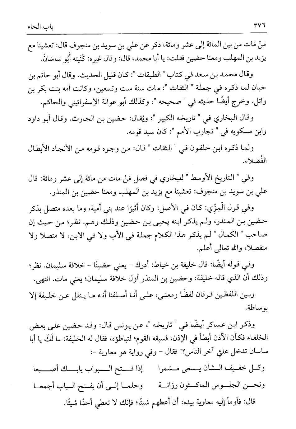 وفي قوله أيضًا: قال خليفة بن خياط: أدرك -يعني حضينًا- خلافة سليمان. نظر؛ وذلك أن الذي قاله خليفة: وحضين بن المنذر أول خلافة سليمان؛ يعني مات. انتهى.