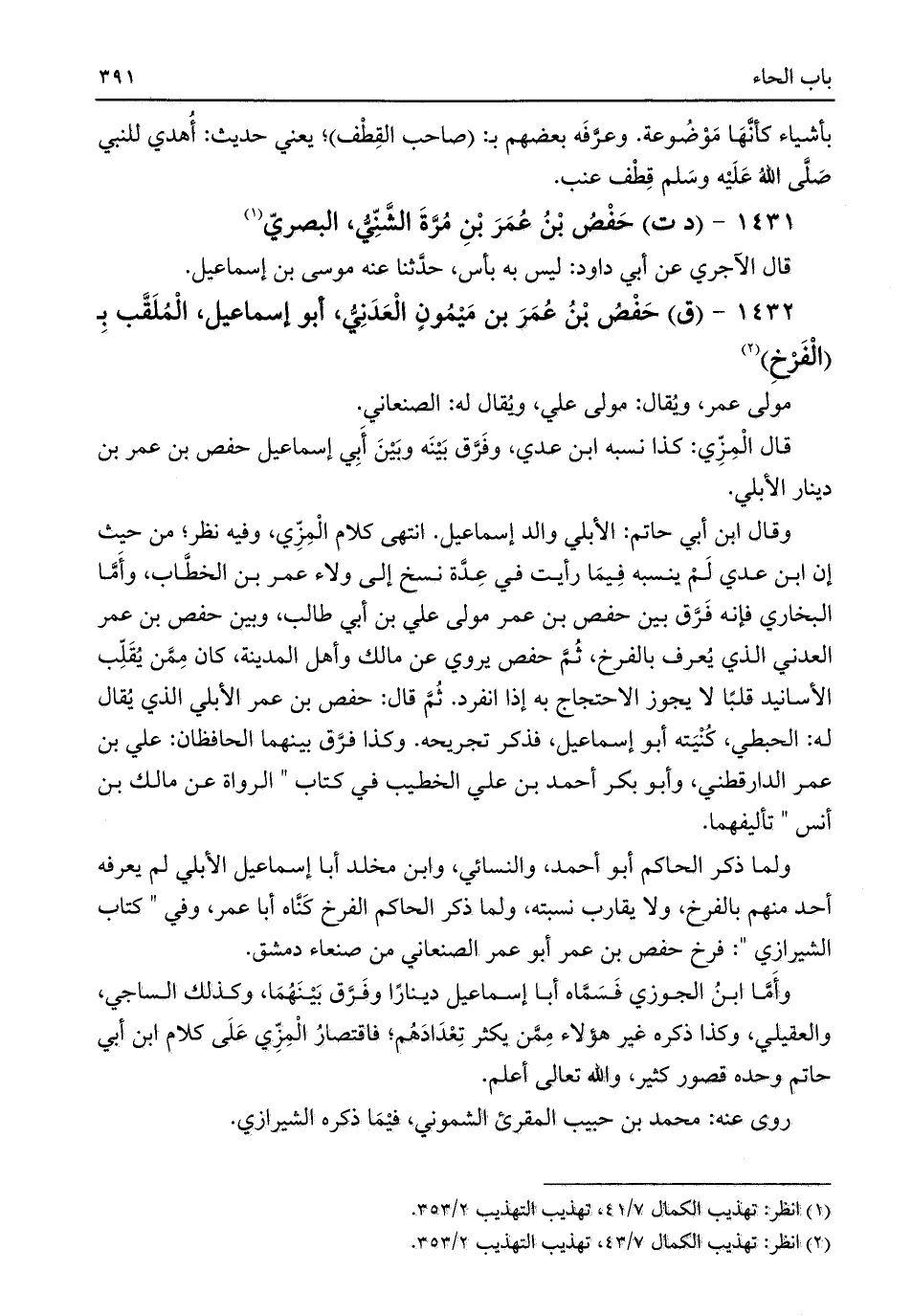 وقال ابن أبي حاتم: الأبلي والد إسماعيل. انتهى كلام الْمِزِّي، وفيه نظر، من حيث إن ابن عدي لَمْ ينسبه فِيمَا رأيت في عِدَّة نسخ إلى ولاء عمر بن الخطَّاب، وأَمَّا البخاري فإنه فَرَّق بين حفص بن عمر مولى علي بن أبي طالب، وبين حفص بن عمر العدني الذي يُعرف بالفرخ، ثُمَّ حفص يروي عن مالك وأهل المدينة، كان مِمَّن يُقَلّب الأسانيد قلبًا لا يجوز الاحتجاج به إذا انفرد. ثُمَّ قال: حفص بن عمر الأبلي الذي يُقال له: الحبطي، كُنْيَته أبو إسماعيل، فذكر تجريحه. وكذا فرَّق بينهما الحافظان: علي بن عمر الدارقطني، وأبو بكر أحمد بن علي الخطيب فى كتاب "الرواة عن مالك بن أنس" تأليفهما.