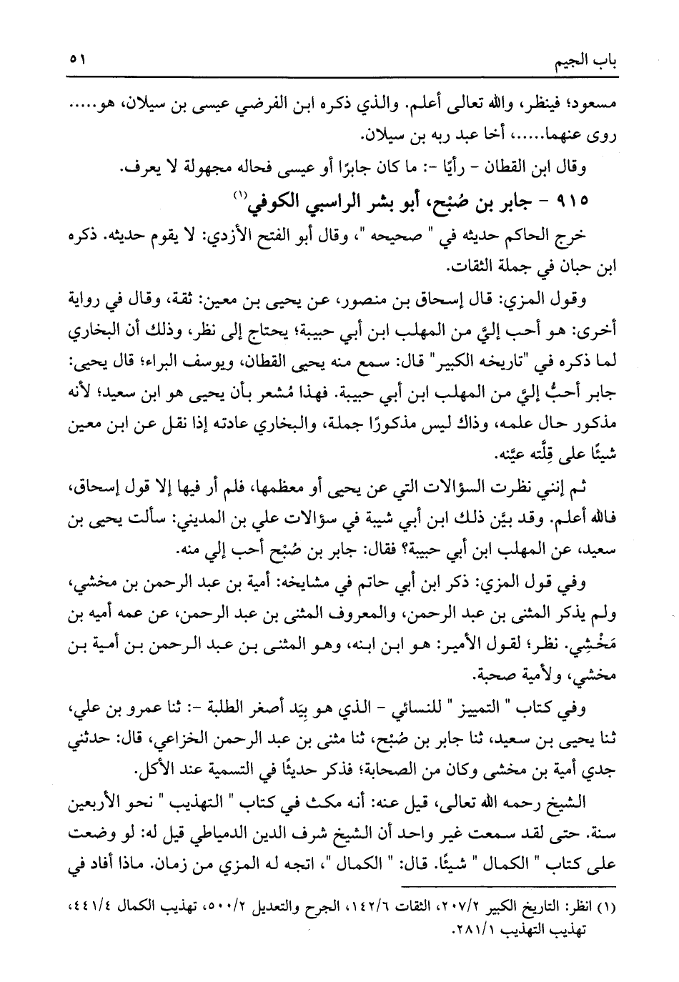 وقول المزي: قال إسحاق بن منصور، عن يحيى بن معين: ثقة، وقال في رواية أخرى: هو أحب إليَّ من المهلب ابن أبي حبيبة؛ يحتاج إلى نظر، وذلك أن البخاري لما ذكره في "تاريخه الكبير" قال: سمع منه يحيى القطان، ويوسف البراء، قال يحيى: جابر أحبُّ إليَّ من المهلب ابن أبي حبيبة. فهذا مُشعر بأن يحيى هو ابن سعيد؛ لأنه مذكور حال علمه، وذاك ليس مذكورًا جملة، والبخاري عادته إذا نقل عن ابن معين شيئًا على قِلَّته عيَّنه.