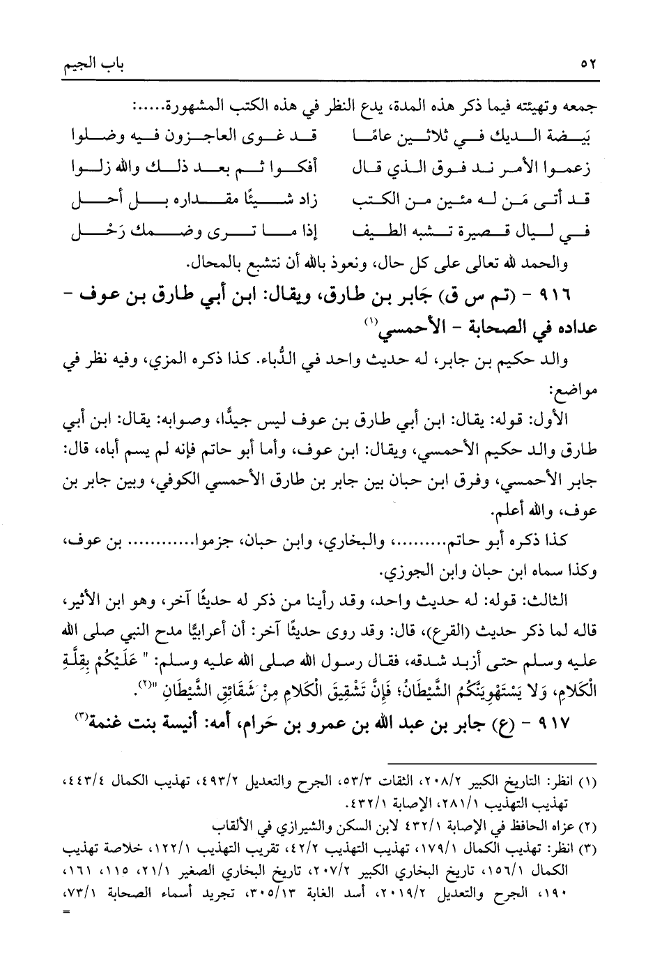 الأول: قوله: يقال: ابن أبي طارق بن عوف ليس جيّدًا، وصوابه: يقال: ابن أبي طارق والد حكيم الأحمسي، ويقال: ابن عوف، وأما أبو حاتم فإنه لم يسم أباه، قال: جابر الأحمسي، وفرق ابن حبان بين جابر بن طارق الأحمسي الكوفي، وبين جابر بن عوف، واللَّه أعلم.