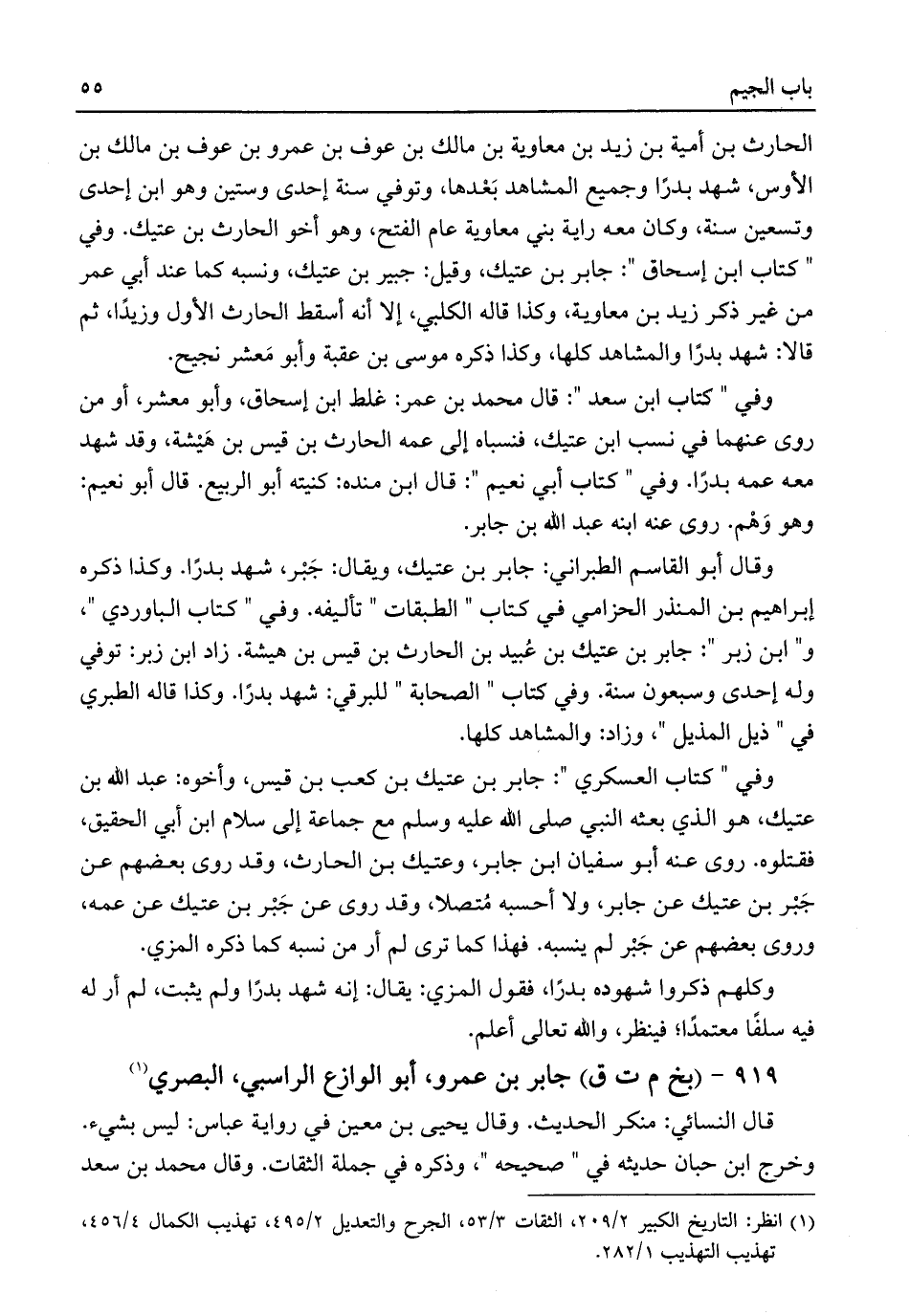 وقال أبو القاسم الطبراني: جابر بن عتيك، ويقال: جَبْر، شهد بدرًا. وكذا ذكره إبراهيم بن المنذر الحزامي في كتاب "الطبقات" تأليفه. وفي "كتاب الباوردي"، و"ابن زبر": جابر بن عتيك بن عُبيد بن الحارث بن قيس بن هيشة. زاد ابن زبر: توفي وله إحدى وسبعون سنة. وفي كتاب "الصحابة" للبرقي: شهد بدرًا. وكذا قاله الطبري في "ذيل المذيل"، وزاد: والمشاهد كلها.