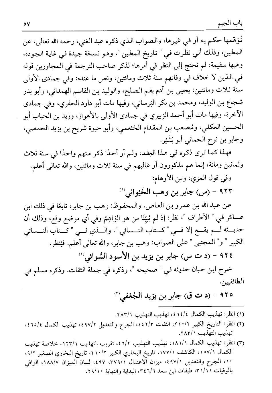 تَوَهّمها حكم به أو في غيرها، والصواب الذي ذكره عبد الغني، رحمه اللَّه تعالى، عن المطين، وذلك أني نظرت في "تاريخ المطين"، وهو نسخة جيدة في غاية الجودة، وهبها سقيمة، لم نحتج إلى النظر في أمرها؛ لذكر صاحب الترجمة في المجاورين قوله في الذين لا خلاف في وفاتهم سنة ثلاث ومائتين، ونص ما عنده: وفي جمادى الأولى سنة ثلاث ومائتين: يحيى بن آدم بفم الصلح، والوليد بن القاسم الهمداني، وأبو بدر شجاع بن الوليد، ومحمد بن بكر البُرساني، وفيها مات أبو داود الحفري، وفي جمادى الآخرة، وفيها مات أبو أحمد الزبيري في جمادى الأولى بالأهواز، وزيد بن الحباب أبو الحسين العكلي، ومُصعب بن المقدام الخثعمي، وأبو حيوة شريح بن يزيد الحمصي، وجابر بن نوح الحماني أبو بُشَيْر.