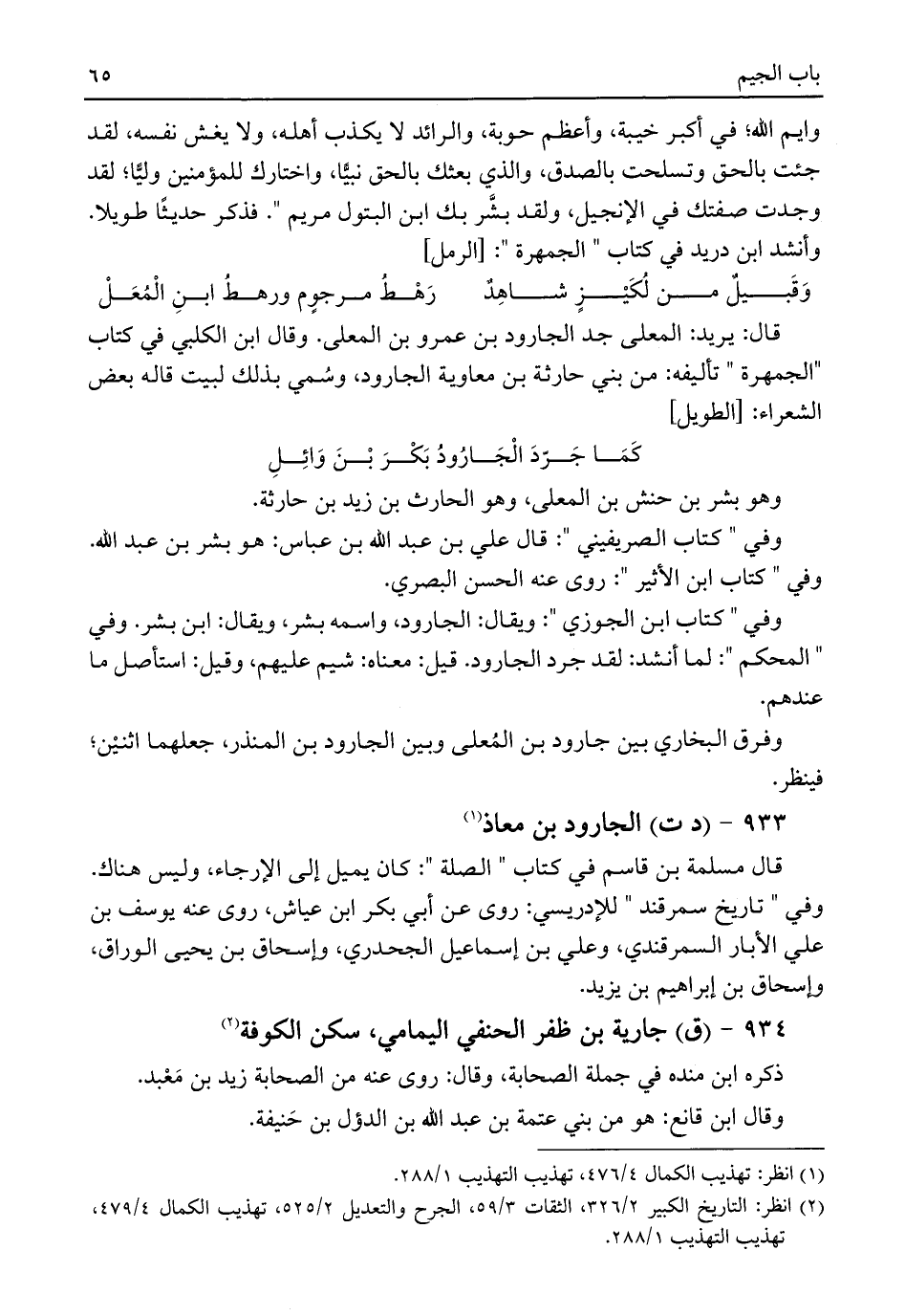قال: يريد: المعلى جد الجارود بن عمرو بن المعلى. وقال ابن الكلبي في كتاب "الجمهرة" تأليفه: من بني حارثة بن معاوية الجارود، وسُمي بذلك لبيت قاله بعض الشعراء: [الطويل]
