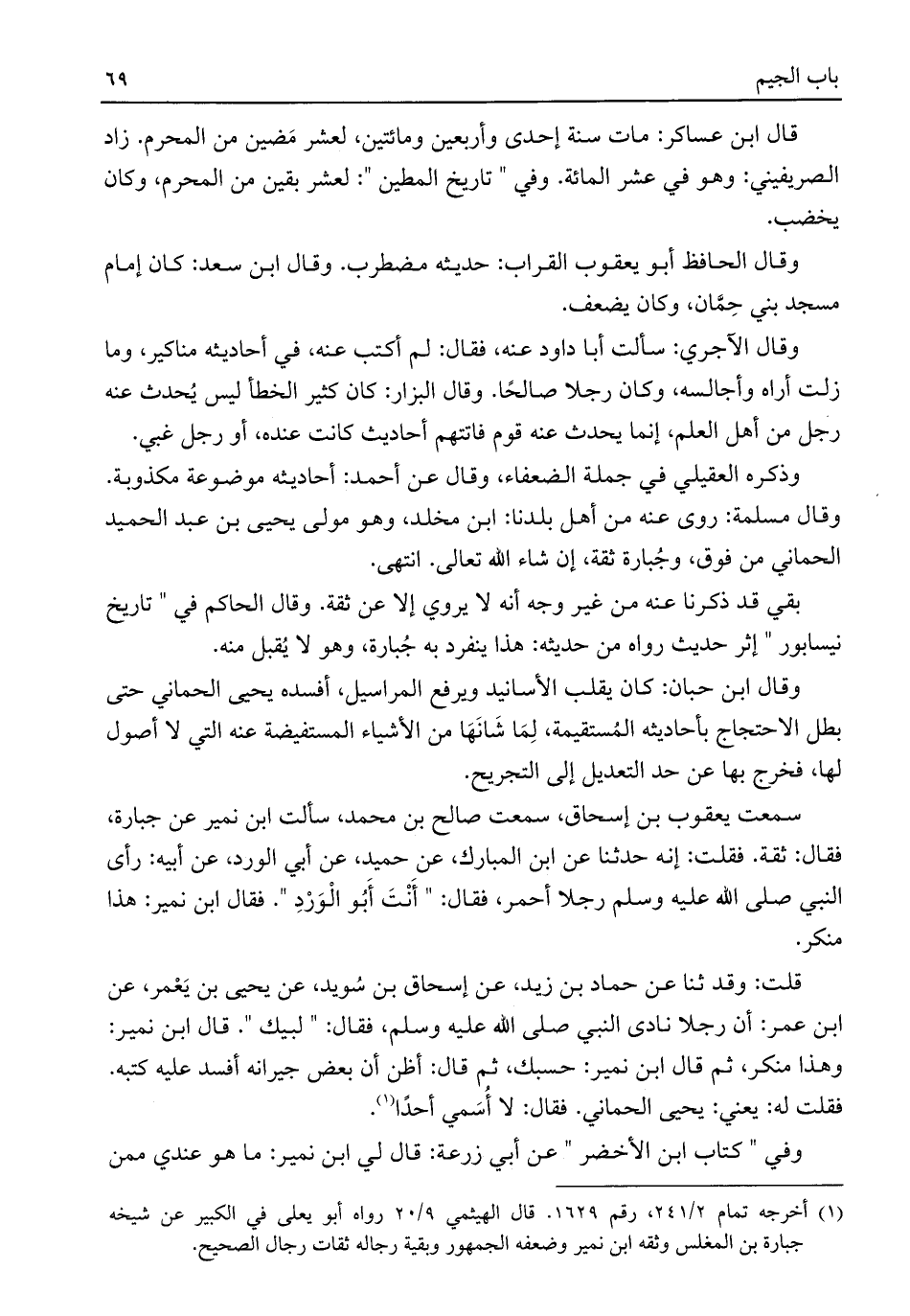 سمعت يعقوب بن إسحاق، سمعت صالح بن محمد، سألت ابن نمير عن جبارة، فقال: ثقة. فقلت: إنه حدثنا عن ابن المبارك، عن حميد، عن أبي الورد، عن أبيه: رأى النبي صلى اللَّه عليه وسلم رجلا أحمر، فقال: "أَنْتَ أَبُو الْوَرْدِ". فقال ابن نمير: هذا منكر.