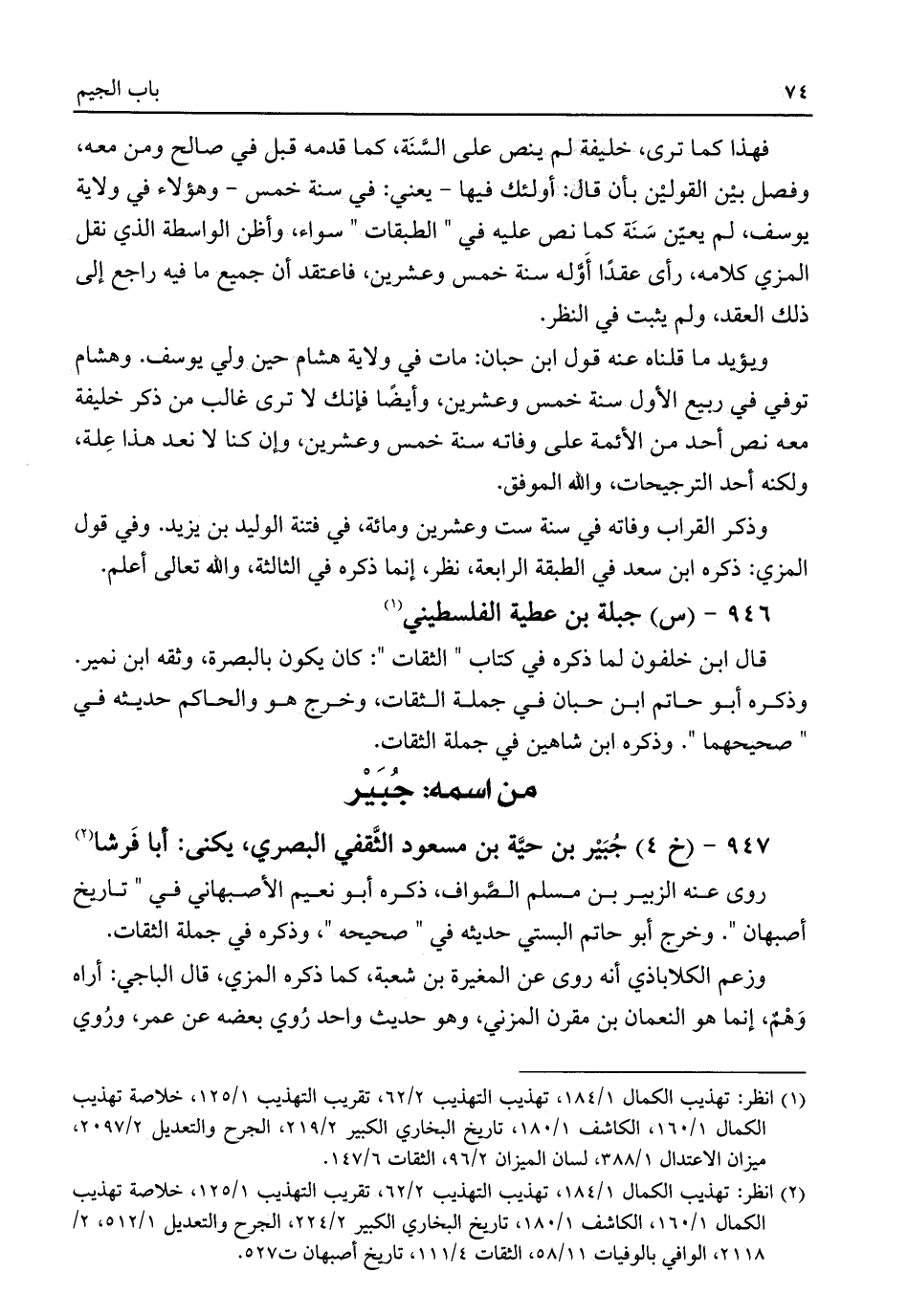 ويؤيد ما قلناه عنه قول ابن حبان: مات في ولاية هشام حين ولي يوسف. وهشام توفي في ربيع الأول سنة خمس وعشرين، وأيضًا فإنك لا ترى غالب من ذكر خليفة معه نص أحد من الأئمة على وفاته سنة خمس وعشرين، وإن كنا لا نعد هذا عِلة، ولكنه أحد الترجيحات، واللَّه الموفق.