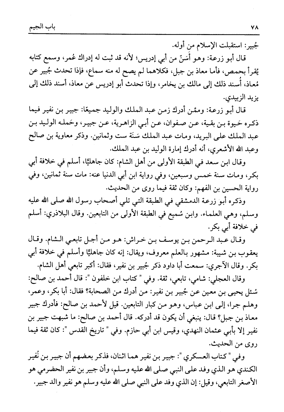 قال أبو زرعة: وهو أَسَنّ من أبي إدريس؛ لأنه قد ثبت له إدراك عُمر، وسمع كتابه يُقرأ بحمص، فأما معاذ بن جبل، فكلاهما لم يصح له منه سماع، فإذا تحدث جُبير عن مُعاذ، أُسند ذلك إلى مالك بن يخامر، وإذا تحدث أبو إدريس عن معاذ، أسند ذلك إلى يزيد الزبيدي.