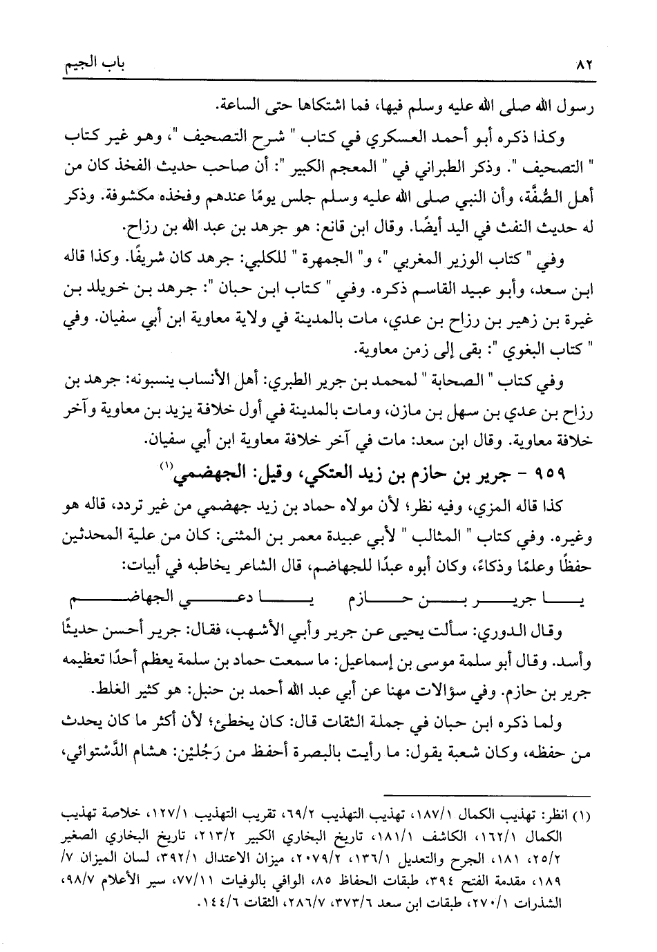 وكذا ذكره أبو أحمد العسكري في كتاب "شرح التصحيف"، وهو غير كتاب "التصحيف". وذكر الطبراني في "المعجم الكبير": أن صاحب حديث الفخذ كان من أهل الصُّفَّة، وأن النبي صلى اللَّه عليه وسلم جلس يومًا عندهم وفخذه مكشوفة. وذكر له حديث النفث في اليد أيضًا. وقال ابن قانع: هو جرهد بن عبد اللَّه بن رزاح.