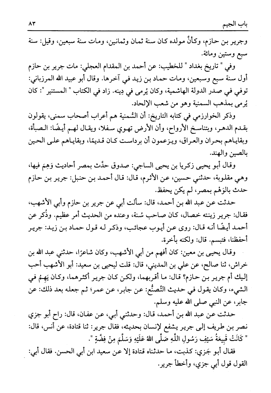 وفي "تاريخ بغداد" للخطيب: عن أحمد بن المقدام العجلي: مات جرير بن حازم أول سنة سبع وسبعين، ومات حماد بن زيد في آخرها. وقال أبو عبيد اللَّه المرزباني: توفي في صدر الدولة الهاشمية، وكان يُرمى في دِينه. زاد في الكتاب "المستنير": كان يُرمى بمذهب السمنية وهو من شعب الإلحاد.