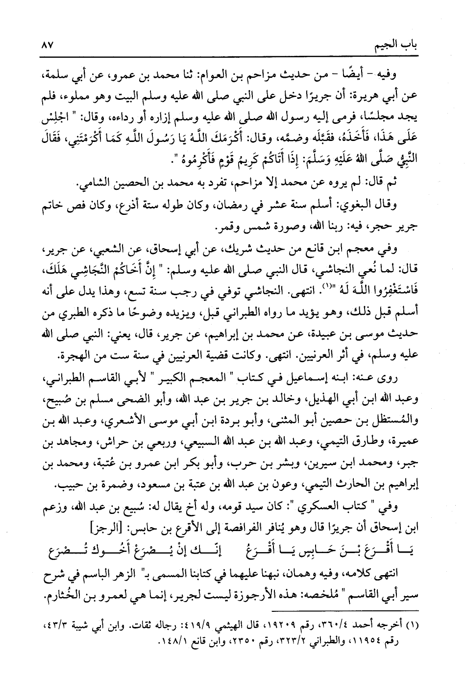وفيه -أيضًا- من حديث مزاحم بن العوام: ثنا محمد بن عمرو، عن أبي سلمة، عن أبي هريرة: أن جريرًا دخل على النبي صلى اللَّه عليه وسلم البيت وهو مملوء، فلم يجد مجلسًا، فرمى إليه رسول اللَّه صلى اللَّه عليه وسلم إزاره أو رداءه، وقال: "اجْلِسْ عَلَى هَذَا، فَأَخَذَهُ، فقَبَّلَه وضمَّه، وقال: أَكْرَمَكَ اللَّهُ يَا رَسُولَ اللَّهِ كَمَا أَكْرَمْتَنِي، فَقَالَ النَّبِيُّ صَلَّى اللَّهُ عَلَيْهِ وَسَلَّمَ: إِذَا أَتَاكُمْ كَرِيمُ قَوْمٍ فَأَكْرِمُوهُ".