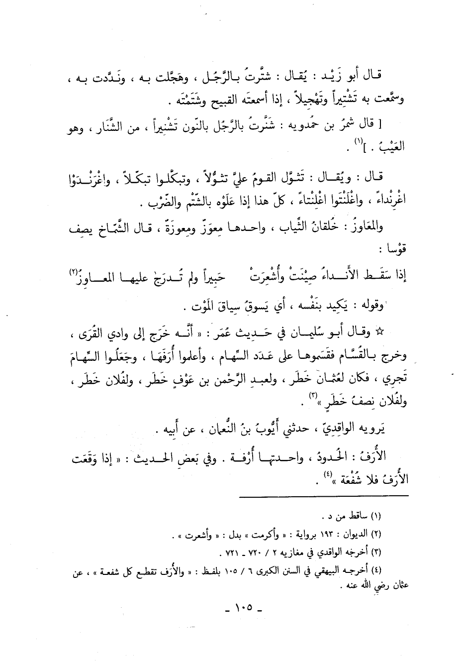 قَالَ شمر بن حمدويه شنرت بالرجل بالنون تشنيرا من الشنار وهو العيب 1.