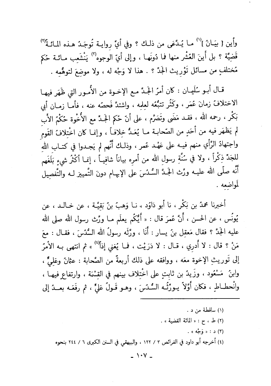 أَخْبَرَنَا مُحَمَّدُ بْنُ بَكْرٍ أخبرنا أبو داود أخبرنا وَهْبُ بْنُ بَقِيَّةَ عَنْ خَالِدٍ عَنْ يُونُسَ عَنِ الْحَسَنِ أَنَّ عُمَرَ قَالَ: أَيُّكُمْ يَعْلَمُ مَا ورث رسول الله الْجَدَّ فَقَالَ مَعْقَلُ بْنُ يَسَارٍ أَنَا وَرَّثَهُ رَسُولُ اللَّهِ السُّدُسَ فَقَالَ: مَعَ مَنْ قَالَ: لا أدري قال: لا دريت فما يُغْنِي إِذًا 4 ثُمَّ انْتَهَى بِهِ الأَمْرُ إِلَى تَوْرِيثِ الإِخْوَةِ مَعَهُ وَوَافَقَهُ عَلَى ذَلِكَ أَرْبَعَةٌ مِنَ الصَّحَابَةِ عُثْمَانُ وَعَلِيٌّ وَابْنُ مَسْعُودٍ وَزَيْدُ بْنُ ثَابِتٍ عَلَى اخْتِلافٍ بَيْنَهُمْ فِي الْقِسْمَةِ وَارْتِفَاعٍ فِيهَا وَانْحِطَاطٍ فَكَانَ أَوَّلا يُوَرِّثُهُ السُّدُسَ وَهُوَ قَوْلُ عَلِيٍّ ثُمَّ رَفَعَهُ بعد إلى
