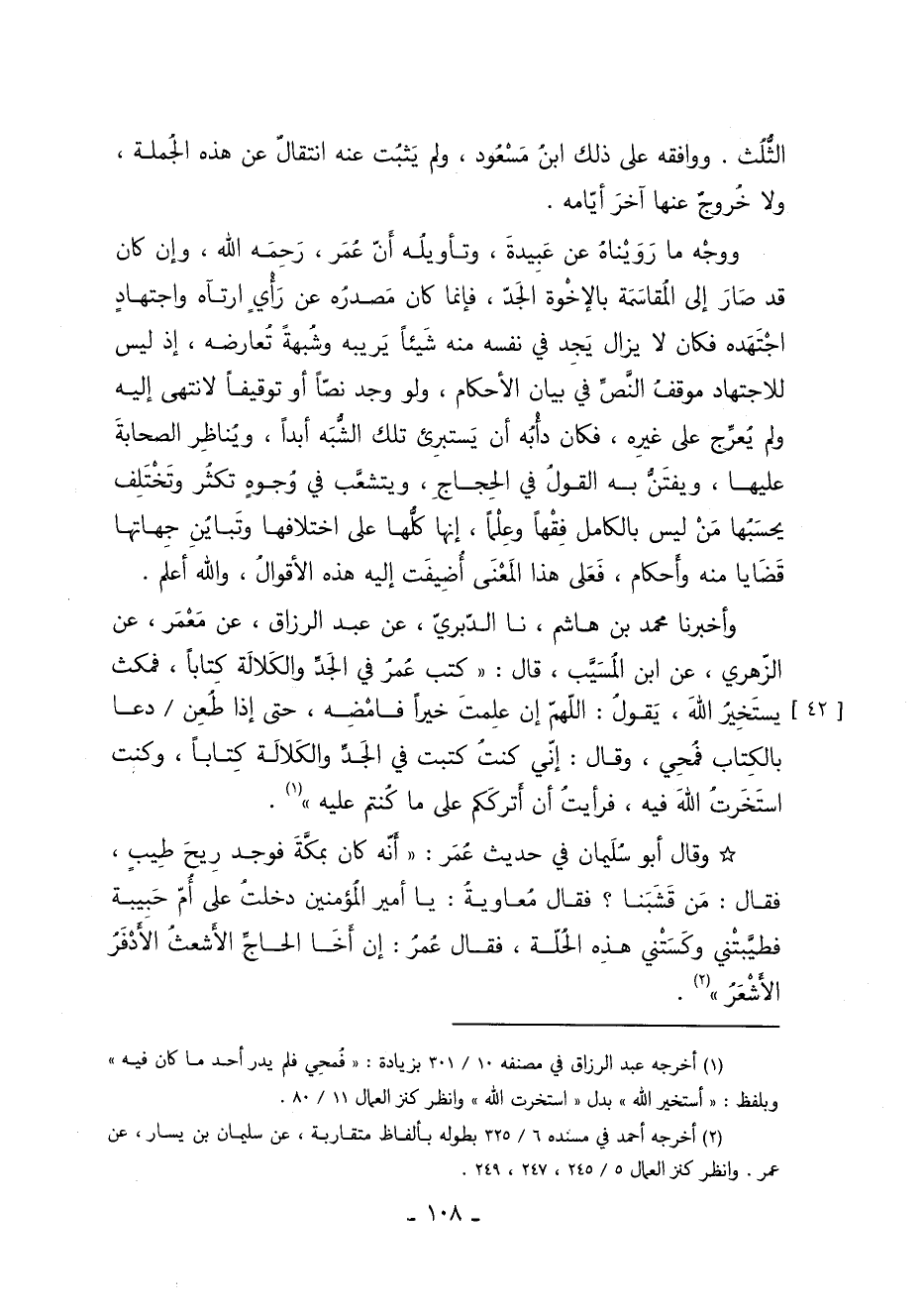 وأخبرنا محمد بن هاشم أخبرنا الدَّبَرِيُّ عَنْ عَبْدِ الرَّزَّاقِ عَنْ مَعْمَرٌ عَنِ الزُّهْرِيِّ عَنِ ابْنِ الْمُسَيِّبِ قَالَ: كَتَبَ [42] عُمَرُ فِي الْجَدِّ وَالْكَلالَةِ كِتَابًا فَمَكَثَ يَسْتَخِيرُ اللَّهُ يَقُولُ اللَّهُمَّ إِنْ عَلِمْتَ خَيْرًا فَامْضِهِ حَتَّى إِذَا طُعِنَ / دَعَا بِالْكِتَابِ فَمُحِيَ وَقَالَ: إِنِّي كُنْتُ كَتَبْتُ فِي الْجَدِّ وَالْكَلالَةِ كِتَابًا وَكُنْتُ اسْتَخَرْتُ اللَّهَ فِيهِ فَرَأَيْتُ أَنْ أَتْرُكَكُمْ عَلَى مَا كنتم عليه 1.