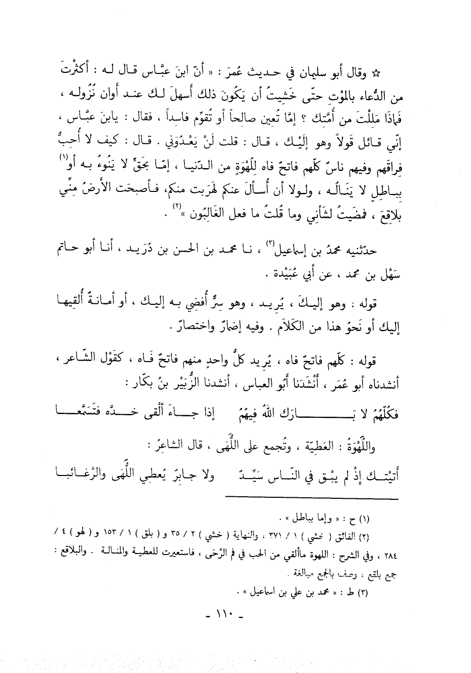 وَقَالَ أَبُو سُلَيْمَانَ فِي حَدِيثِ عُمَرَ أَنَّ ابْنَ عَبَّاسٍ قَالَ لَهُ: أَكْثَرْتَ مِنَ الدُّعَاءِ بِالْمَوْتِ حَتَّى خَشِيتُ أَنْ يَكُونَ ذَلِكَ أَسْهَلَ لَكَ عِنْدَ أَوَانِ نُزُولِهِ فلماذا مَلِلْتَ مِنْ أُمَّتِكَ إِمَّا تُعِينُ صَالِحًا أَوْ تُقَوِّمُ فَاسِدًا فَقَالَ: يابن عَبَّاسٍ إِنِّي قَائِلٌ قَوْلا وَهُوَ إِلَيْكَ قَالَ: قُلْتُ لَنْ يَعْدُونِي. قال: كَيْفَ لا أُحِبُّ فِرَاقَهُمْ وَفِيهِمْ نَاسٌ كُلُّهُمْ فَاتِحٌ فَاهُ لِلْهُوَّةِ مِنَ الدُّنْيَا. إِمَّا بِحَقٍّ لا يَنُوءُ بِهِ أَوْ 1 بِبَاطِلٍ لا يَنَالُهُ وَلَوْلا أَنْ أُسْأَلَ عَنْكُمْ لَهَرَبْتُ مِنْكُمْ فَأَصْبَحَتِ الأَرْضُ مِنِّي بَلاقِعَ فَمَضَيْتُ لِشَأْنِي وَمَا قُلْتُ مَا فَعَلَ الْغَالِبُونَ 2.