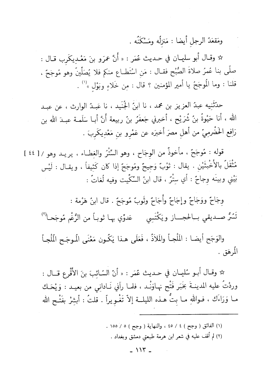 وَقَالَ أَبُو سُلَيْمَانَ فِي حَدِيثِ عمر أن عمرو بن معديكرب قَالَ: صَلَّى بِنَا عُمَرُ صَلاةَ الصُّبْحِ فَقَالَ: مَنِ اسْتَطَاعَ مِنْكُمْ فَلا يُصَلِّيَنَّ وَهُوَ مُوجَحٌ قُلْنَا وَمَا الْمُوجِحُ يَا أَمِيرَ الْمُؤْمِنِينَ قَالَ: مَنْ خَلاءٍ وَبَوْلٍ 1.