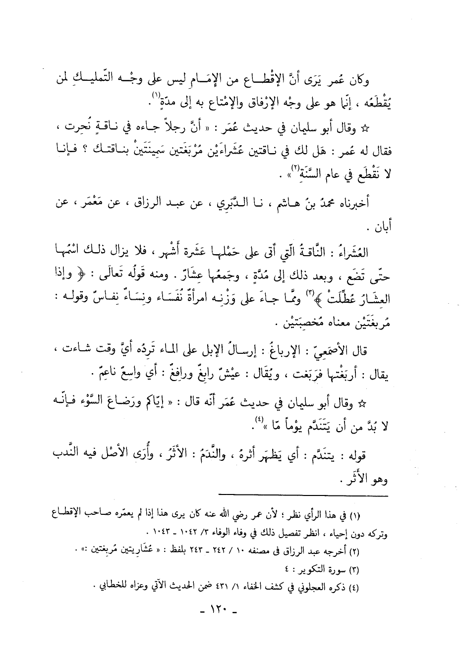 وَقَالَ أَبُو سُلَيْمَانَ فِي حَدِيثِ عمر أن رجلا جاءه فِي نَاقَةٍ نُحِرَتْ فَقَالَ لَهُ عُمَرُ: هَلْ لَكَ فِي نَاقَتَيْنِ عُشْرَاءَيْنِ مُرْبَغَتَيْنِ سَمِينَتَيْنِ بِنَاقَتِكَ فَإِنَّا لا نَقْطَعُ فِي عَامٍ السَّنَةِ 1.