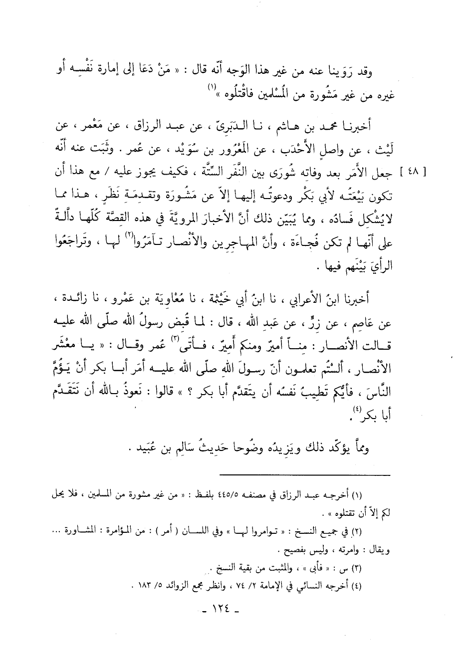 أخبرنا محمد بن هاشم أخبرنا الدبري عن عبد الرزاق عَنْ مَعْمَرٍ عَنْ لَيْثٍ عَنْ وَاصِلٍ الأَحْدَبِ عَنِ الْمَعْرُورِ [48] بْنِ سُوَيْدٍ عَنْ عُمَرَ. وثبت عنه أَنَّهُ جعل الأمر بعد وفاته شورى بين النفر الستة فكيف يجوز عليه / مع هذا أن تكون بيعته لأبي بكر ودعوته إليها إلا عَنْ مشورة وتقدمة نظر هذا مما لا يشكل فساده ومما يبين ذلك أن الأخبار المروية في هذه القصة كلها دالة على أنها لم تكن فجاءة وأن المهاجرين والأنصار تآمروا 2 لها وتراجعوا الرأي بينهم فيها.