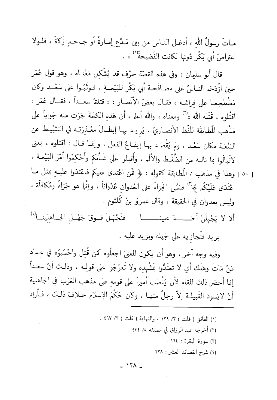 قَالَ أَبُو سُلَيْمَانَ وفي هذه القصة حرف قد يشكل معناه وهو قول عُمَر حين ازدحم الناس على مصافحة أبي بكر للبيعة فوثبوا على سعد وكان مضطجعا على فراشه فَقَالَ بعض الأنصار قتلتم سعدا فَقَالَ عُمَر "اقتلوه قتله اللَّه"2 ومعناه والله أعلم أن هذه الكلمة جرت منه جوابا على مذهب المطابقة للفظ الأنصاري يريد بها إبطال معذرته في التثبيط عَنِ البيعة مكان سعد ولم يقصد بها إيقاع الفعل وإنما قَالَ اقتلوه بمعنى لا [50] تبالوا بما ناله من الضغط والألم وأقبلوا على شأنكم وأحكموا أمر البيعة وهذا في مذهب / المطابقة كقوله {فَمَنِ اعْتَدَى عَلَيْكُمْ فَاعْتَدُوا عَلَيْهِ بِمِثْلِ مَا اعْتَدَى عَلَيْكُمْ} 3 فسمي الجزاء على العدوان عدوانا وإنما هو جزاء ومكافأة وليس بعدوان في الحقيقة وَقَالَ عمرو بن كلثوم: