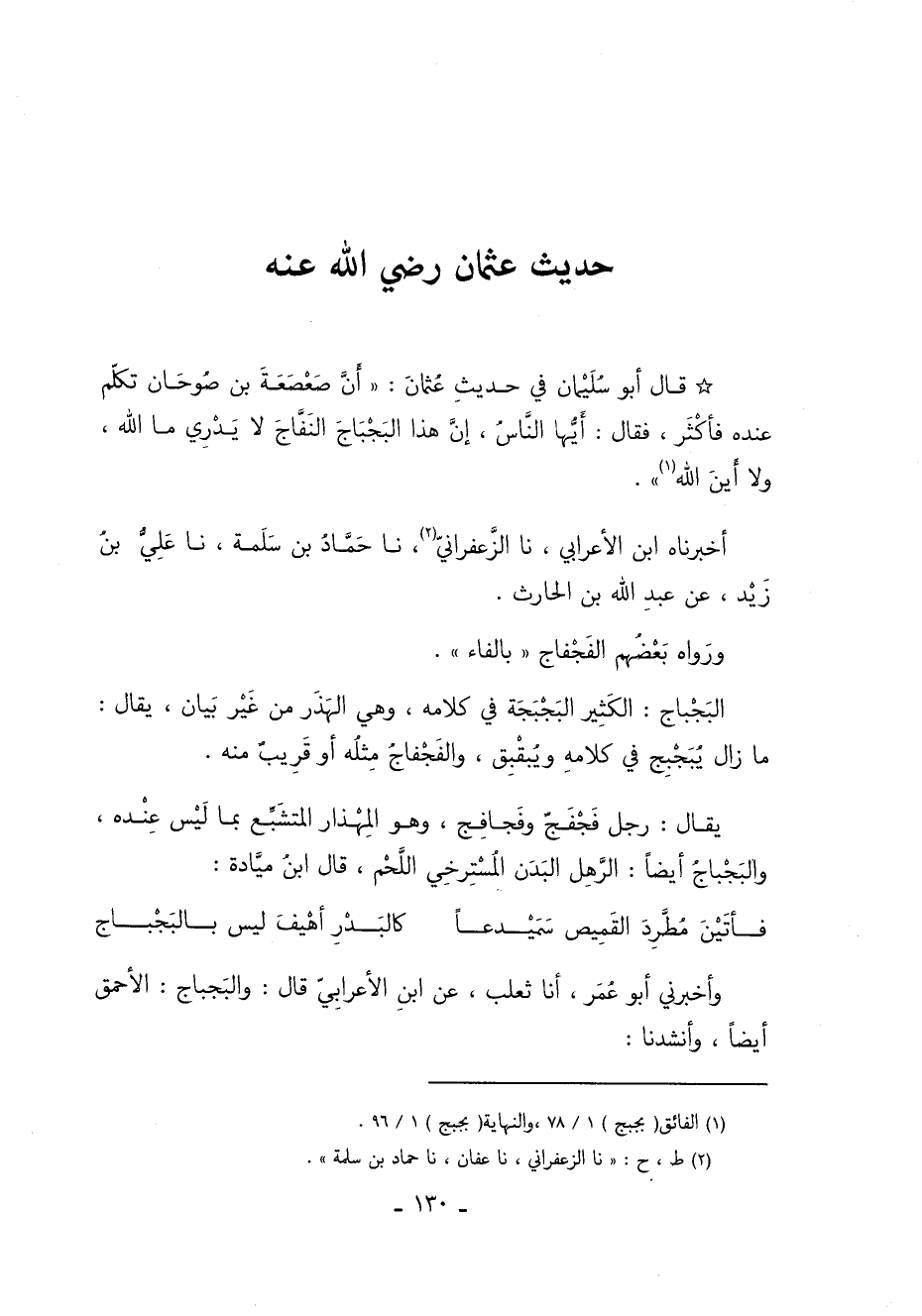 قَالَ أَبُو سُلَيْمَانَ فِي حَدِيثِ عُثْمَانَ أَنَّ صَعْصَعَةَ بْنَ صَوْحَانَ تَكَلَّمَ عِنْدَهُ فَأَكْثَرَ فَقَالَ أَيُّهَا النَّاسُ إِنَّ هَذَا الْبَجْبَاجَ النَفَّاجَ لا يَدْرِي مَا اللَّهُ وَلا أَيْنَ اللَّهُ 1.