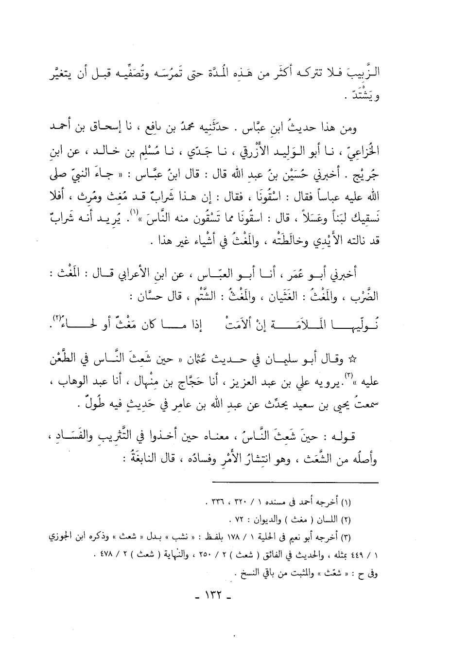 وَمِنْ هذا حديث ابن عياش. حدثنيه محمد بن نافع أخبرنا إسحاق بن أحمد الخزاعي أخبرنا أبو الوليد الأزرقي أخبرنا جدي أخبرنا مُسْلِمُ بْنُ خَالِدٍ عَنِ ابْنِ جريج. أخبرني حسين بن عبد الله قَالَ قَالَ ابْنُ عَبَّاسٍ جَاءَ النبي عَبَّاسًا فَقَالَ اسْقُونَا فَقَالَ إِنَّ هَذَا شَرَابٌ قَدْ مُغِثَ وَمُرِثَ أَفَلا نَسْقِيكَ لَبَنًا وَعَسَلا قَالَ اسْقُونَا مِمَّا تَسْقُونَ مِنْهُ النَّاسَ 1. يُرِيدُ أَنَّهُ شَرَابٌ قَدْ نَالَتْهُ الأَيْدِي وَخَالَطَتْهُ وَالْمُغُثُ فِي أَشْيَاءٍ غَيْرِ هَذَا.