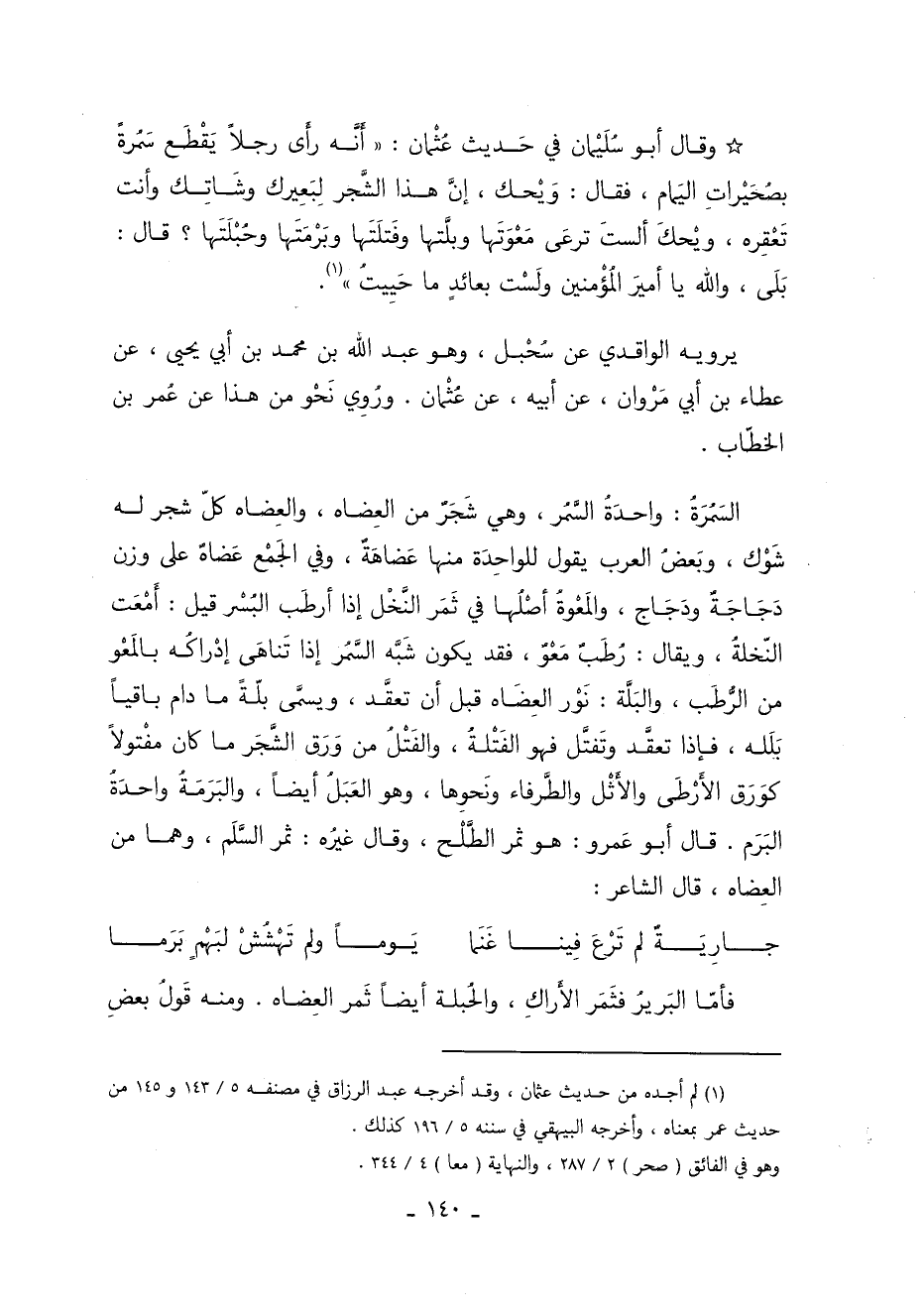 وَقَالَ أَبُو سُلَيْمَانَ فِي حَدِيثِ عُثْمَانَ أَنَّهُ رَأَى رَجُلا يَقْطَعُ سمرة الْيَمَامِ فَقَالَ وَيْحَكَ إِنَّ هَذَا الشَّجَرَ لِبَعِيرِكَ وَشَاتِكَ وَأَنْتَ تَعْقِرُهُ. وَيْحَكَ أَلَسْتَ تَرْعَى مَعْوَتَهَا وَبَلَّتْهَا وَفَتْلَتْهَا وَبَرْمَتَهَا وَحُبْلَتَهَا قَالَ بَلَى. وَاللَّهِ يَا أَمِيرَ الْمُؤْمِنِينَ وَلَسْتُ بِعَائِدٍ مَا حَيِّيتُ 1.