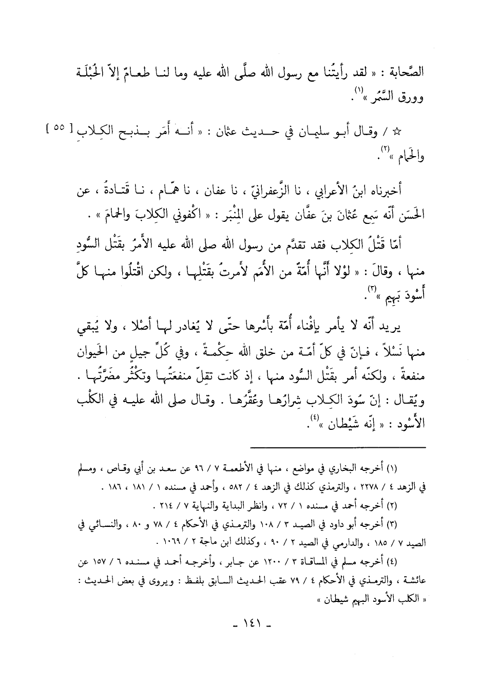 أَمَّا قَتْلُ الْكِلابِ فَقَدْ تَقَدَّمَ مِنْ رسول الله الأَمْرُ بِقَتْلِ السُّودِ مِنْهَا وَقَالَ لَوْلا أَنَّهَا أُمَّةٌ مِنَ الأُمَمِ لأَمَرْتُ بِقَتْلِهَا وَلَكِنِ اقْتُلُوا مِنْهَا كُلَّ أَسْوَدٍ بَهِيمٍ 2.