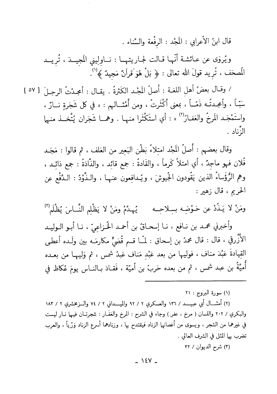 / وَقَالَ بعض أهل اللغة: أصل المجد الكثرة. يقال أمجدت الرجل سبا وأمجدته ذما بمعنى أكثرت [57] ومن أمثالهم في كل شجرة نار واستمجد المرخ والعفار 2 أي استكثرا منها وهما شجران يتخذ منهما الزناد.