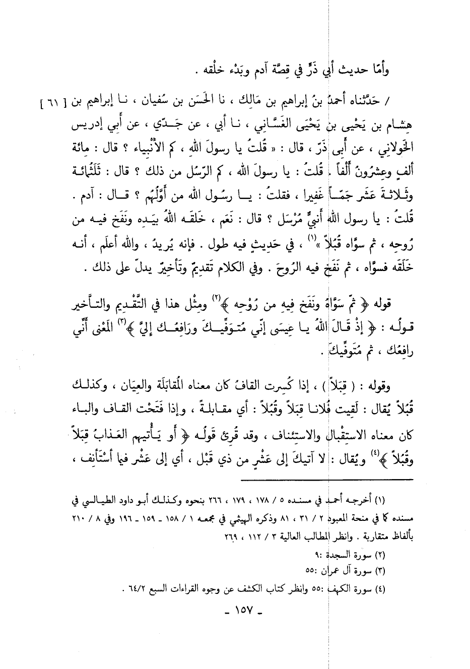 / حَدَّثَنَاهُ أَحْمَدُ بْنُ إِبْرَاهِيمَ بْنِ مَالِكٍ أخبرنا الحسن بن سفيان أخبرنا إِبْرَاهِيمُ بْنُ هِشَامِ بْنِ يَحْيَى بن [61] يحيى الغساني أخبرنا أَبِي عَنْ جَدِّي عَنْ أَبِي إِدْرِيسَ الْخَوْلانِي عَنْ أَبِي ذَرٍّ قَالَ قُلْتُ يَا رَسُولَ اللَّهِ كَمِ الأَنْبِيَاءُ قَالَ "مِائَةُ أَلْفٍ وَعِشْرُونَ أَلْفًا" قُلْتُ يَا رَسُولَ اللَّهِ كَمِ الرُّسُلِ مِنْ ذَلِكَ قال "ثلثمائة وثلاثة عشرة جَمًّا غَفِيرًا" فَقُلْتُ يَا رَسُولَ اللَّهِ مَنْ أَوَّلُهُمْ قَالَ "آدَمُ" قُلْتُ يَا رَسُولَ اللَّهِ أَنَبِيُّ مُرْسَلٌ قَالَ "نَعَمْ خَلَقَهُ اللَّهُ بِيَدِهِ وَنَفَخَ فِيهِ مِنْ رُوحِهِ ثم سواه قبلا 1" وفي حَدِيثٍ فِيهِ طُولٌ فإنه يريد والله أعلم أَنَّهُ خلقه فسواه ثم نفخ فيه الروح. وفي الكلام تقديم وتأخير يدل على ذلك.