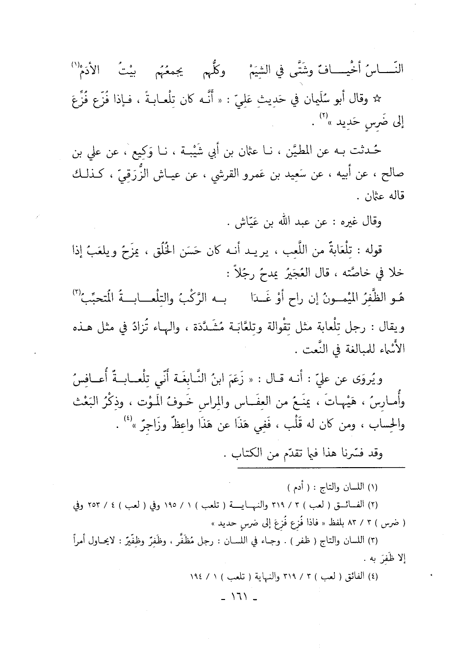 قوله تلعابة من اللعب يريد أنه كان حسن الخلق يمزح ويلعب إذا خلا في خاصته قَالَ العجير يمدح رجلا: وَقَالَ أَبُو سُلَيْمَانَ فِي حَدِيثِ عَلِيٍّ أَنَّهُ كَانَ تِلْعَابَةُ فَإِذَا فَزَعَ فَزَعَ إِلَى ضِرْسٍ حَدِيدٍ 2.