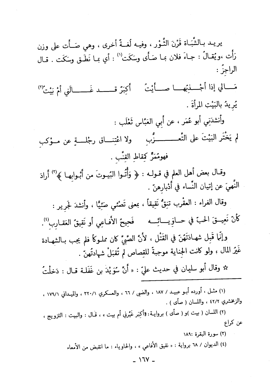 2 اللسان "بيت" و"صأى" برواية "أكبر غيري أم بيت" قال: والبيت: التزويج, عن كراع.