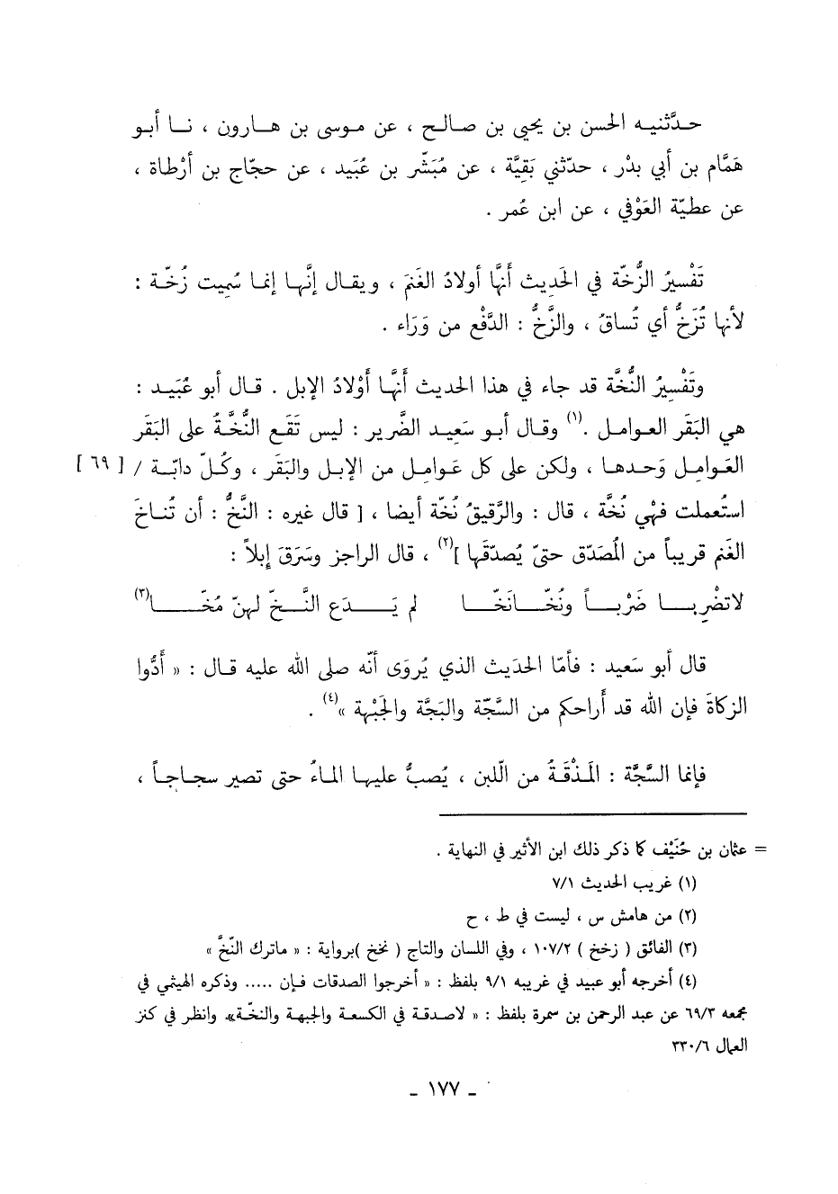 وتفسير النخة قد جاء في هذا الحديث أنها أولاد الإبل. قَالَ أبو عبيد هي البقرة العوامل 1. وَقَالَ أَبُو سعيد الضرير ليس تقع النخة على البقر العوامل وحدها ولكن على كل عوامل من الإبل والبقر وكل [69] دابة / استعملت فهي نخة قَالَ والرقيق نخة أيضا قَالَ غيره النخ أن تناخ الغنم قريبا من المصدق حتى يصدقها 2 قَالَ الراجز وسرق إبلا: