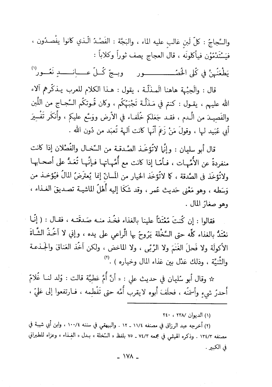 2 أخرجه عبد الرزاق في مصنفه "4/ 11, 12" والبيهقي في سننه "4/ 100" وابن ابي شيبة في مصنفه "3/ 134" وذكره الهيثمي في مجمعه "3/ 74 – 75" بلفظ "السخلة" بدل "الغذاء" وعزاه للطبراني في الكبير.