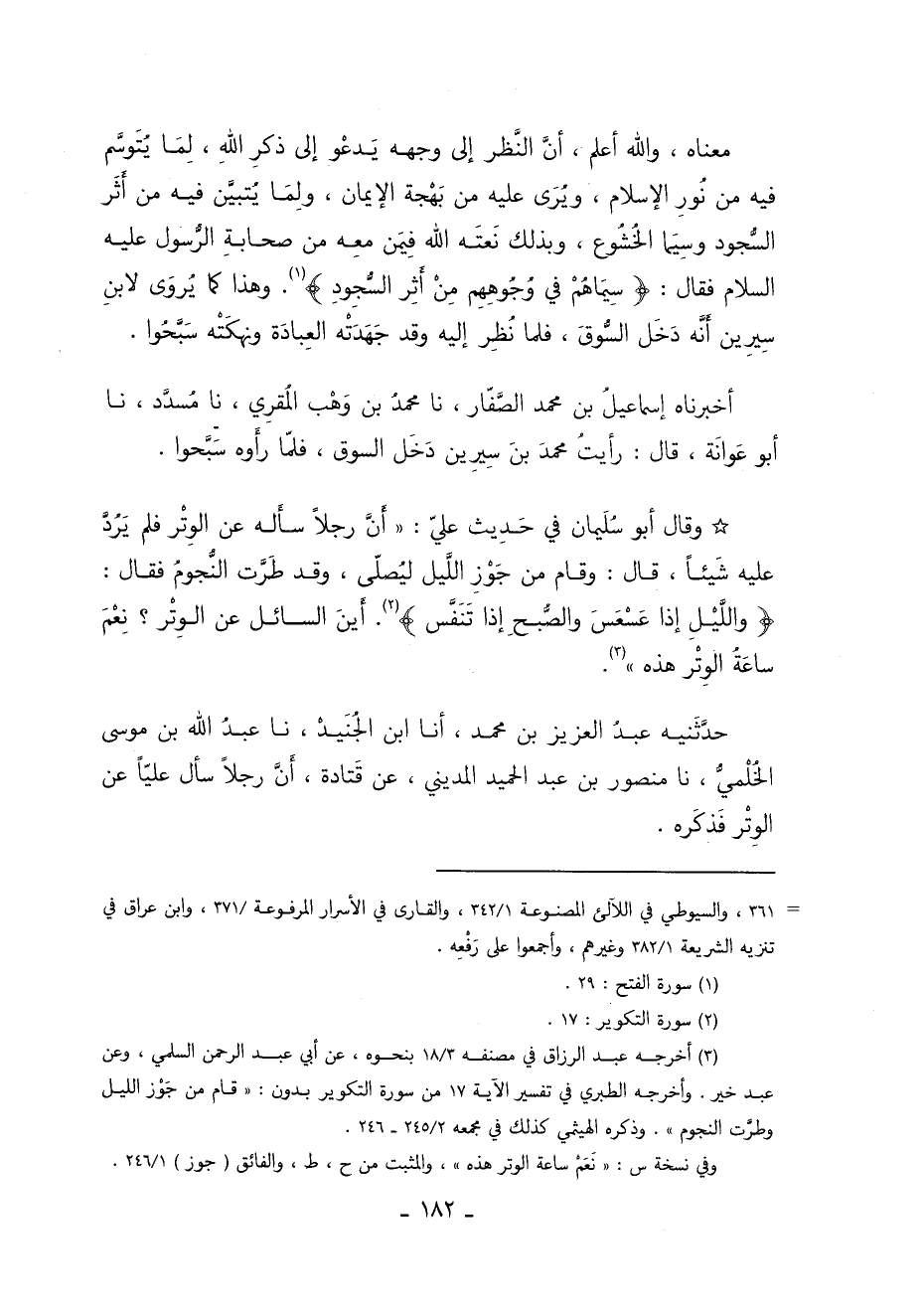 2 أخرجه عبد الرزاق في مصنفه "3/ 18" بنحوه عَنْ أَبِي عَبْدِ الرَّحْمَنِ السُّلَمِيِّ وعن عبد خير وأخرجه الطيري في تفسير الآية "17" من سورة النكوير بدون "قام من جوز الليل وطرت النجوم" وذكره الهيثمي كذلك في مجمعه "2/ 245 – 246".
