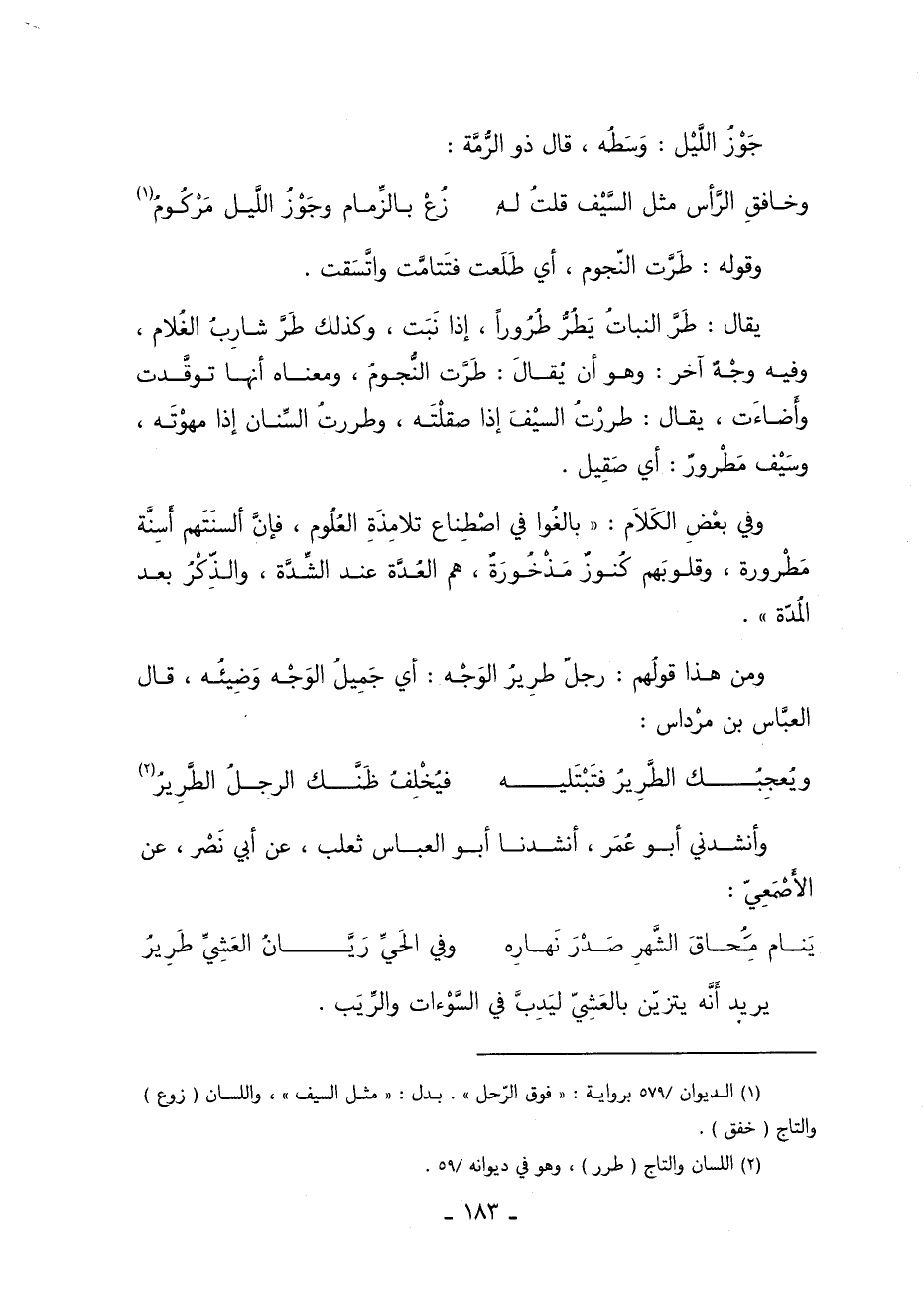 ومن هذا قولهم رجل طرير الوجه أي جميل الوجه وضيئه قَالَ العباس بن مرداس.