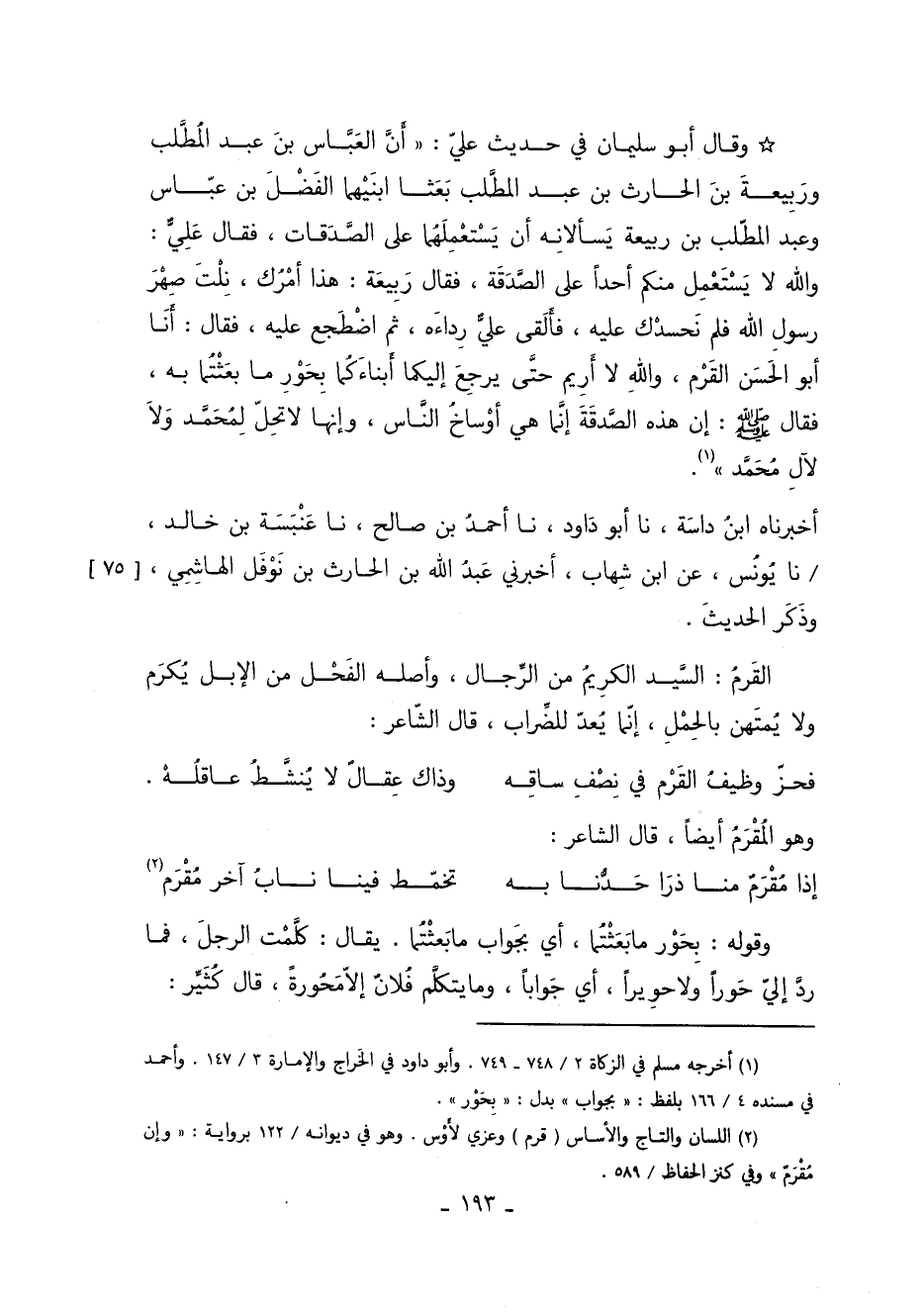 وَقَالَ أَبُو سُلَيْمَانَ فِي حَدِيثِ عَلِيٍّ أَنَّ الْعَبَّاسَ بْنَ عَبْدِ الْمُطَّلِبِ وَرَبِيعَةَ بْنَ الْحَارِثِ بْنِ عَبْدِ الْمُطَّلِبِ بَعَثَا ابْنَيْهِمَا الْفَضْلُ بْنُ عَبَّاسٍ وَعَبْدُ الْمُطَّلِبِ بْنُ رَبِيعَةَ يَسْأَلانِهِ أَنْ يَسْتَعْمِلْهُمَا عَلَى الصَّدَقَاتِ فَقَالَ عَلِيٌّ: وَاللَّهِ لا يستعمل منكم أحدا عَلَى الصَّدَقَةِ فَقَالَ رَبِيعَةُ هَذَا أَمْرُكَ نِلْتَ صِهْرَ رَسُولِ اللَّهِ فَلَمْ نَحْسُدْكَ عَلَيْهِ فَأَلْقَى عَلِيٌّ رِدَاءَهُ ثُمَّ اضْطَجَعَ عَلَيْهِ فَقَالَ أنبأنا أَبُو الْحَسَنِ الْقَرْمُ وَاللِّهِ لا أَرِيمُ حَتَّى يَرْجِعَ إِلَيْكُمَا أَبْنَاءَكُمَا بِحَوْرِ مَا بَعَثْتُمَا بِهِ فَقَالَ صلى الله عليه مسلم: "إِنَّ هَذِهِ الصَّدَقَةَ إِنَّمَا هِيَ أَوْسَاخُ النَّاسِ وَإِنِّهَا لا تَحِلُّ لِمُحَمَّدٍ وَلا لآلِ مُحَمَّدٍ" 1.