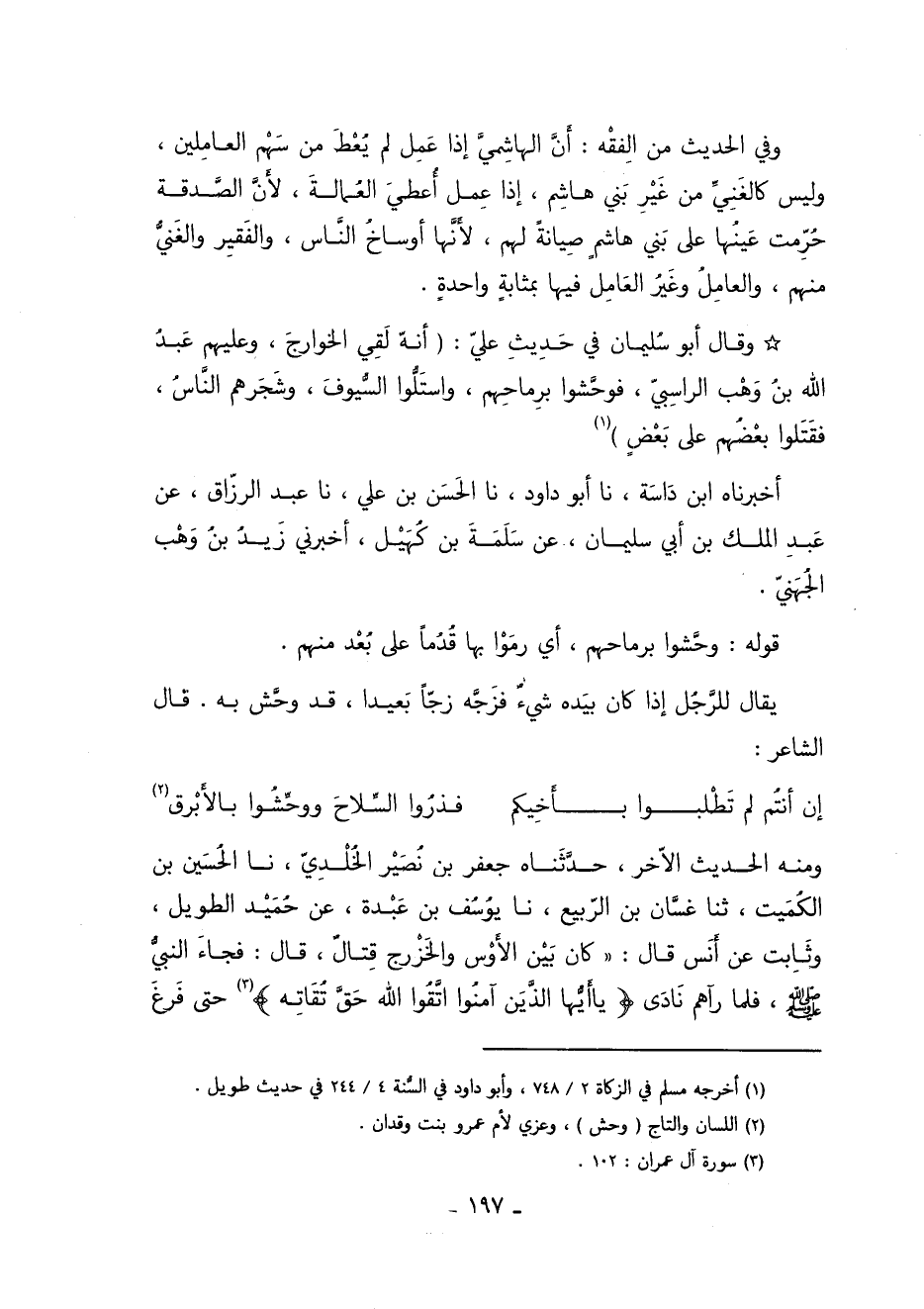 وَقَالَ أَبُو سُلَيْمَانَ فِي حَدِيثِ عَلِيٍّ أَنَّهُ لَقِيَ الْخَوَارِجَ وَعَلَيْهِمْ عبد الله بن وهب الراسي فَوَحَّشُوا بِرِمَاحِهِمْ وَاسْتَلُّوا السُّيُوفَ وَشَجَرَهُمُ النَّاسُ فَقَتَلُوا بَعْضَهُمْ عَلَى بَعْضٍ 1.